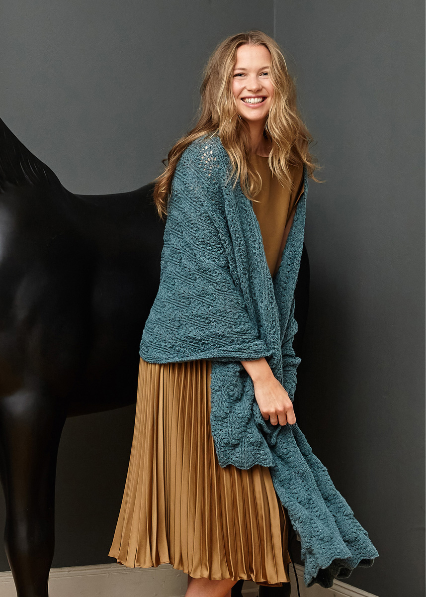 Lana Grossa-kvalitet „Cashmere 16 Fine” (80 % ren ny ull (merino), 10 % kashmir, 10 % polyamid, löplängd = ca. 320 m/50 g): ca. 450 g petrolgrön (färg 40); 1 rundsticka nr. 5, 80 cm lång.