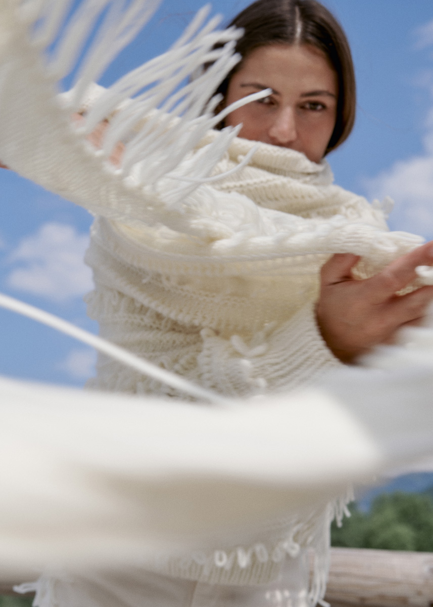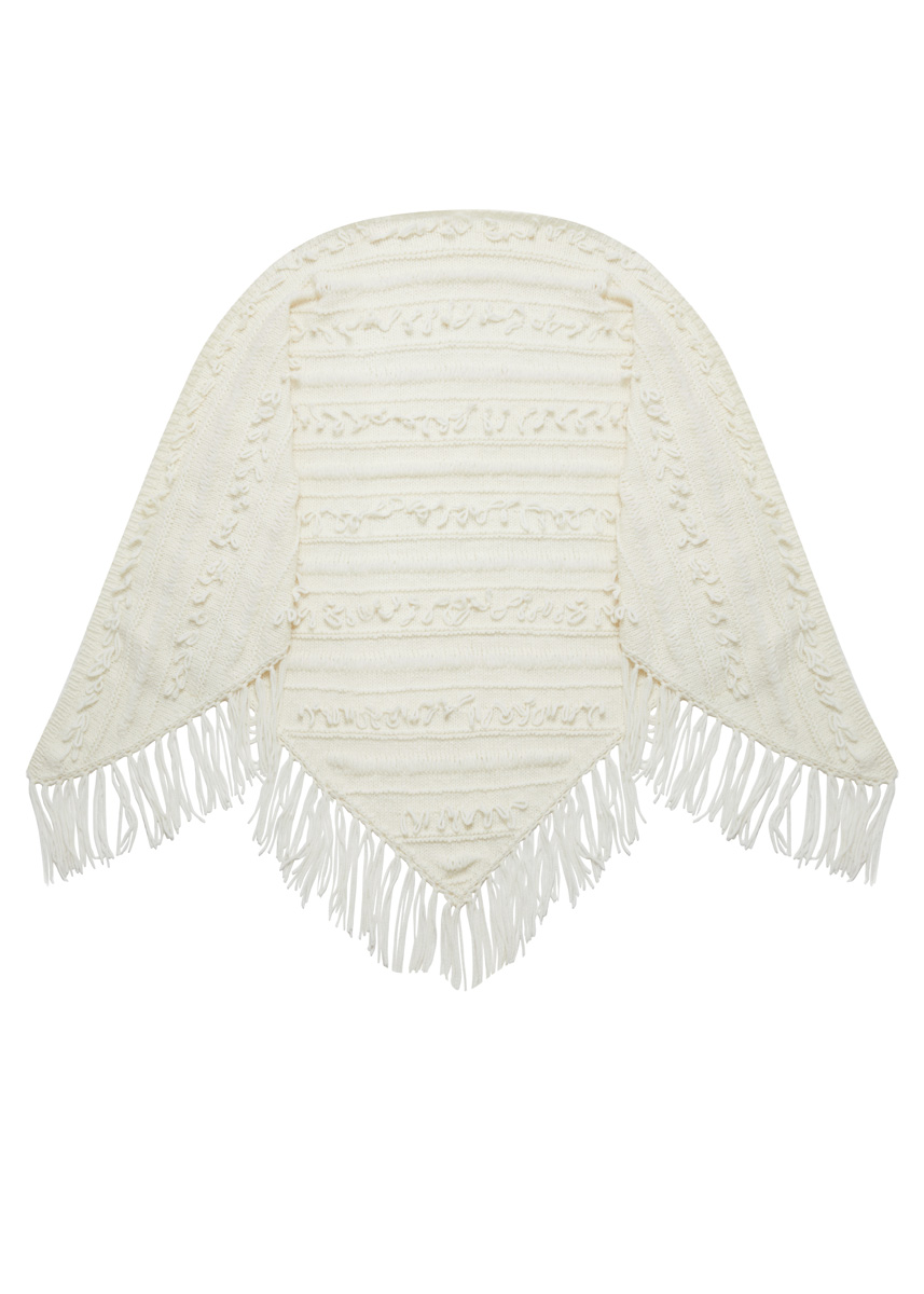 Lana Grossa „Cool Merino“ (90% ren ny ull (merino), 10% polyamid, löplängd = 150 m/50 g): 450 g i Weiß (färg 15); rundstickor nr. 6, 120 cm och 60 cm lång, 1 virknål nr. 5.