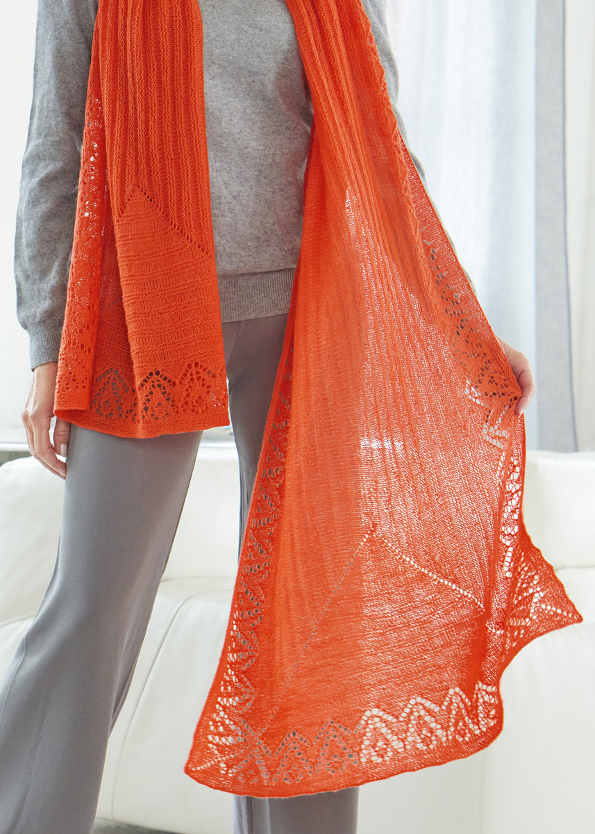 Lana Grossa-kvalitet „Cool Wool Lace“ (100% ren ny ull, löplängd = ca. 400 m/50 g); 200 g laxröd (färg 21); 2 80–100 cm långa rundstickor nr. 3,5; maskhållare