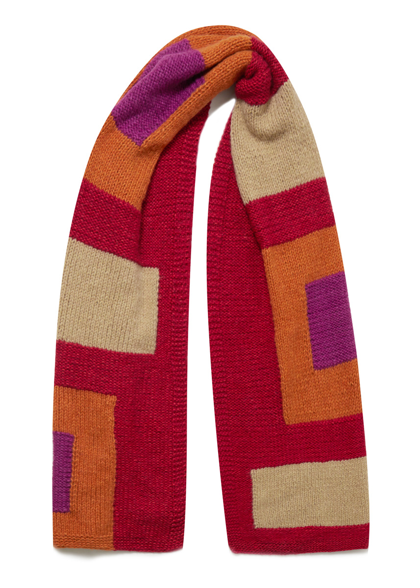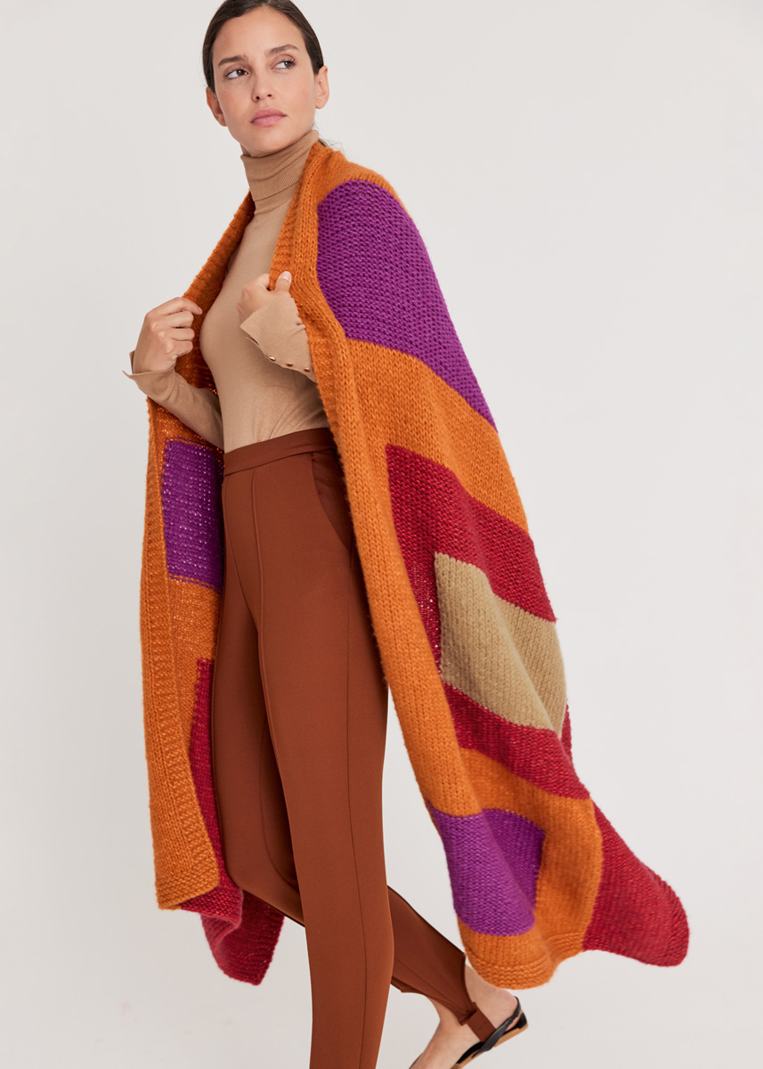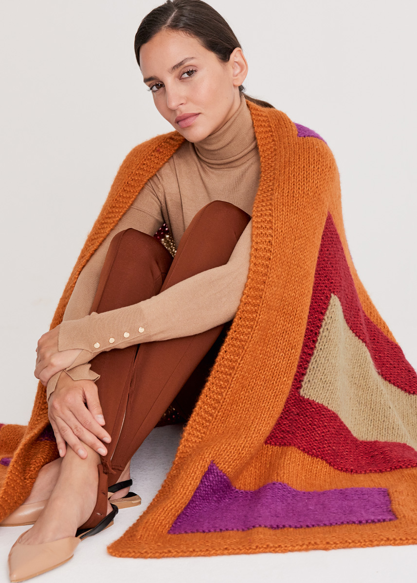 Lana Grossa „Ecopuno Chunky“ (48% bomull, 33% ren ny ull (merino extrafine), 19% alpacka (baby), löplängd 70 m/50 g), 300 g Rost (färg 115), 300 g Weinrot (färg 118), 150 g rödviolett (färg 128) och 150 g kamel (färg 129); stickor nr. 7 och 8.