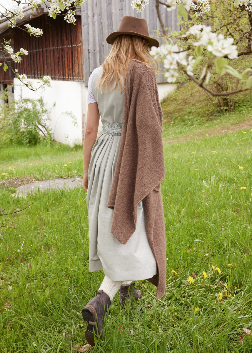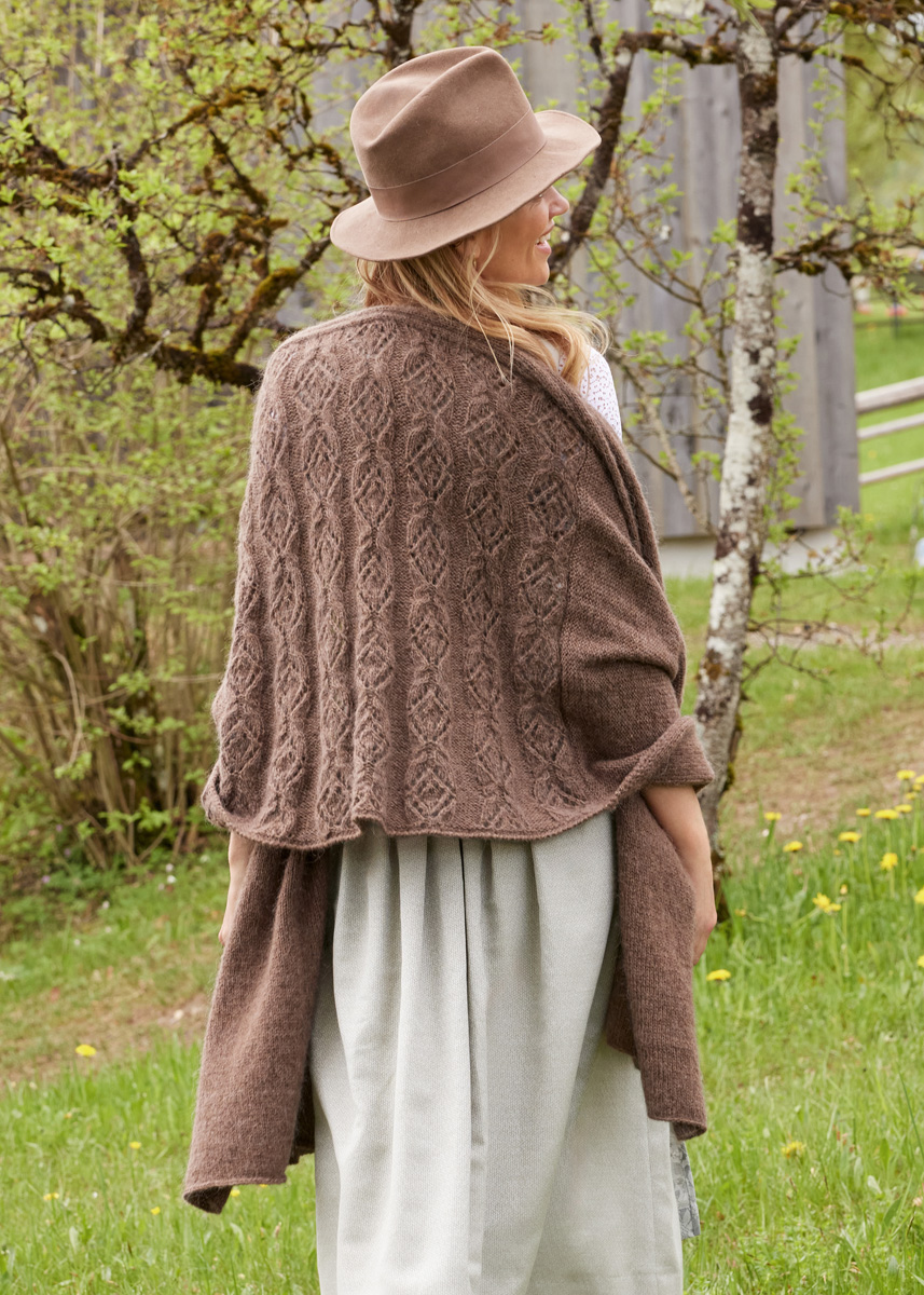 Lana Grossa Ecopuno (72% Baumwolle, 17% Schurwolle (Merino), 11% Alpaka (Baby), Lauflänge 215 m/50 g), 350 g Dunkelbraun (Fb 17) und Lana Grossa Setasuri (69% Alpaka (Suri), 31% Seide, Lauflänge 212 m/25 g), 175 g Nougat (Fb 4); Stricknadeln Nr. 4 und 1 Häkelnadel Nr. 3,5.
