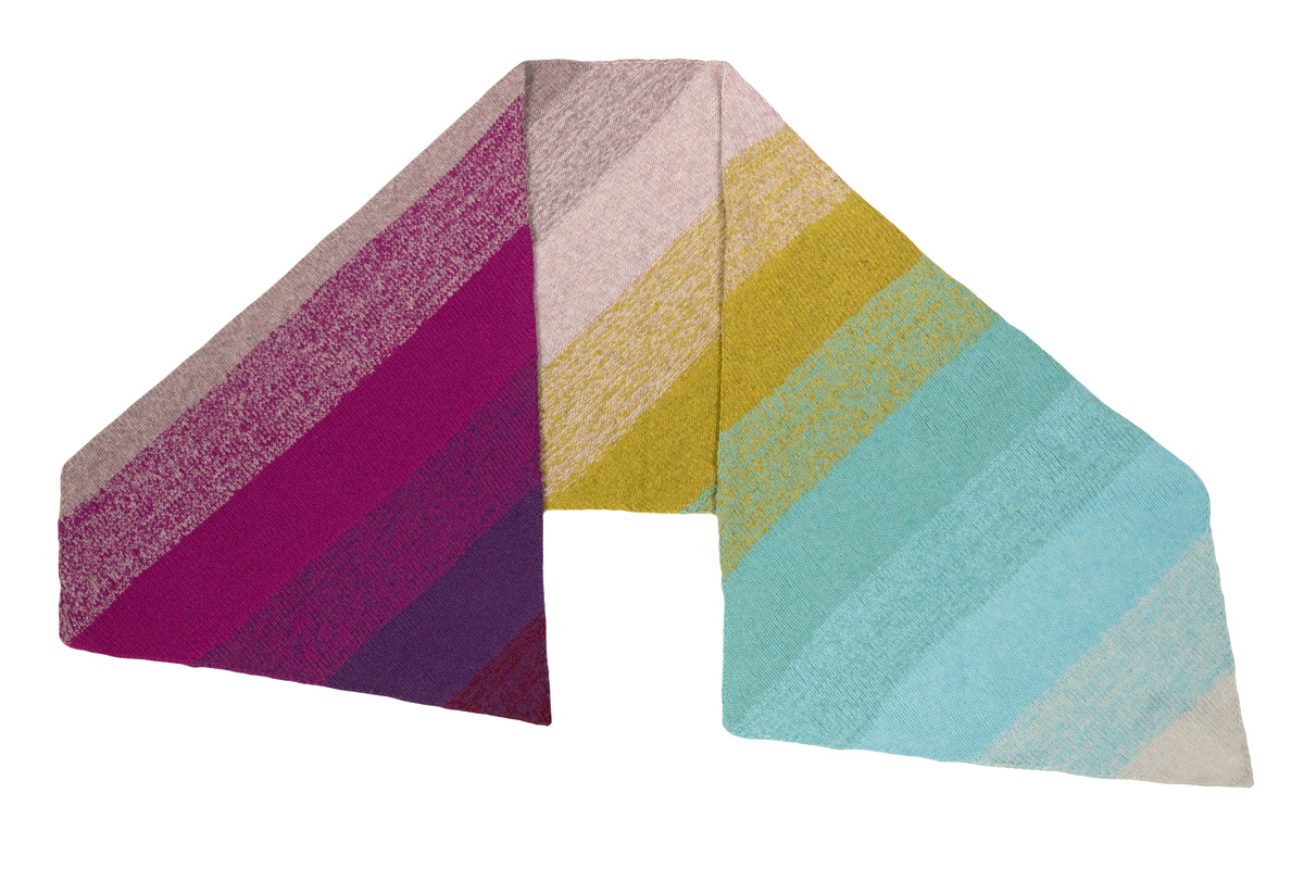 Lana Grossa „Ecopuno“ (72 % bomull, 17 % ren ny ull (merino), 11 % alpacka; löplängd ca. 215 m / 50 g); 50 g var grége (färg 18), bordeaux (färg 35), turkos (färg 28), pastellgrön (färg 38), gulgrön (färg 3), syren (färg 8), lila (färg 30), purpur (färg 22) och bär (färg 40); stickor nr. 7.