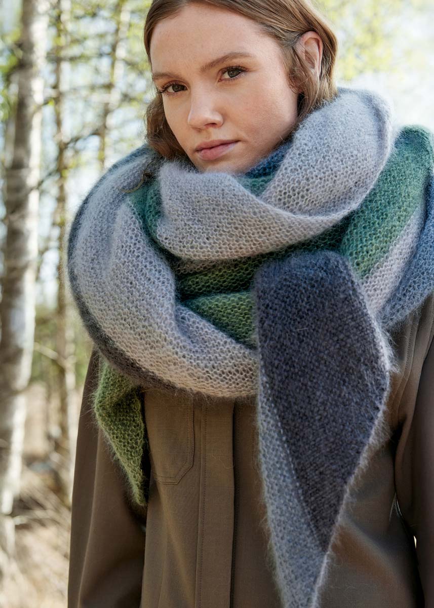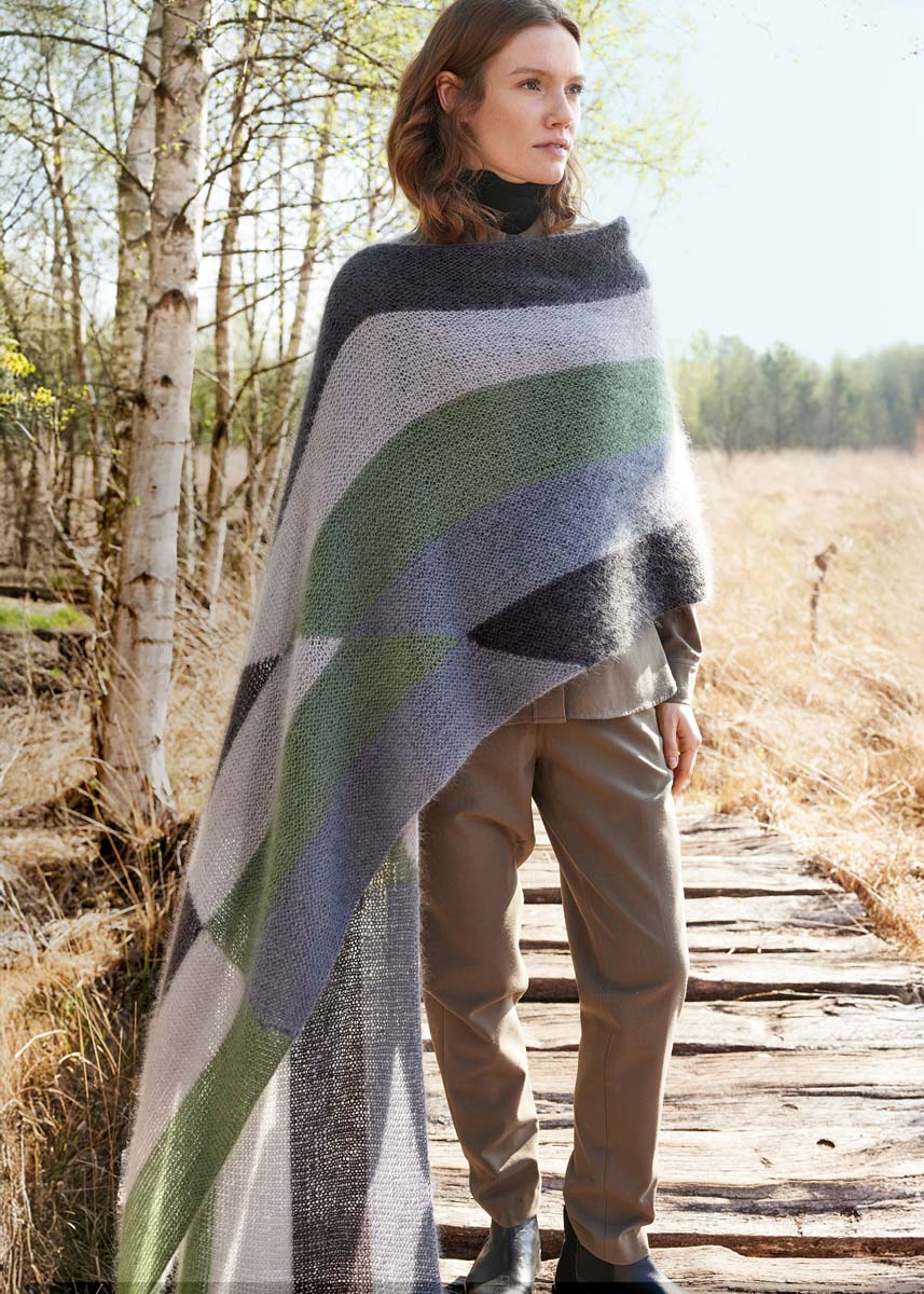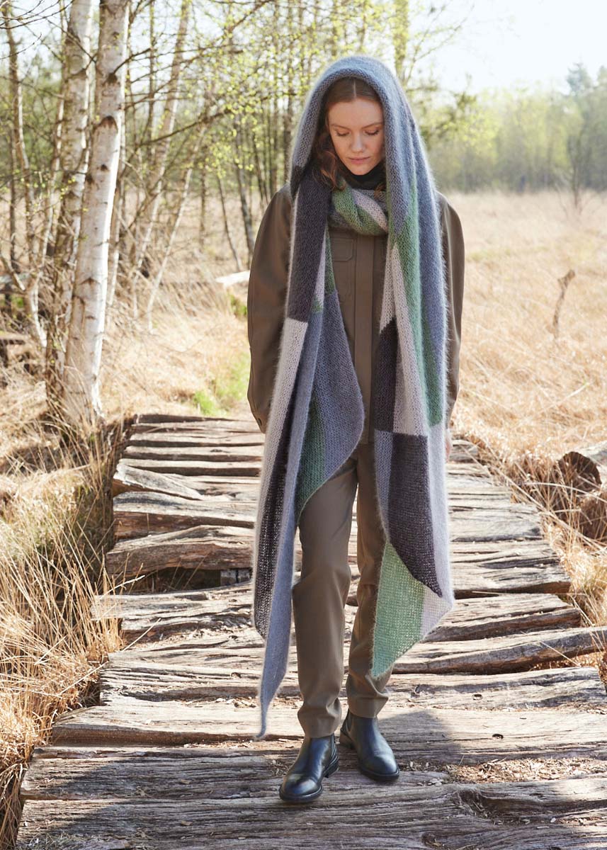 Lana Grossa Silkhair (70% mohair (superkid), 30% silke, løpelengde 210 m/25 g), 100 g hver i gråbeige (farge 184), mørkgrå (farge 12), anthrasitt (farge 183) og mosegrønn (farge 127); 1 rundpinne nr. 5,5, 120 cm lang. Farge A = gråbeige, med doble tråder Farge B = mørkgrå, med doble tråder Farge C = anthrasitt, med doble tråder Farge D = mosegrønn, med doble tråder