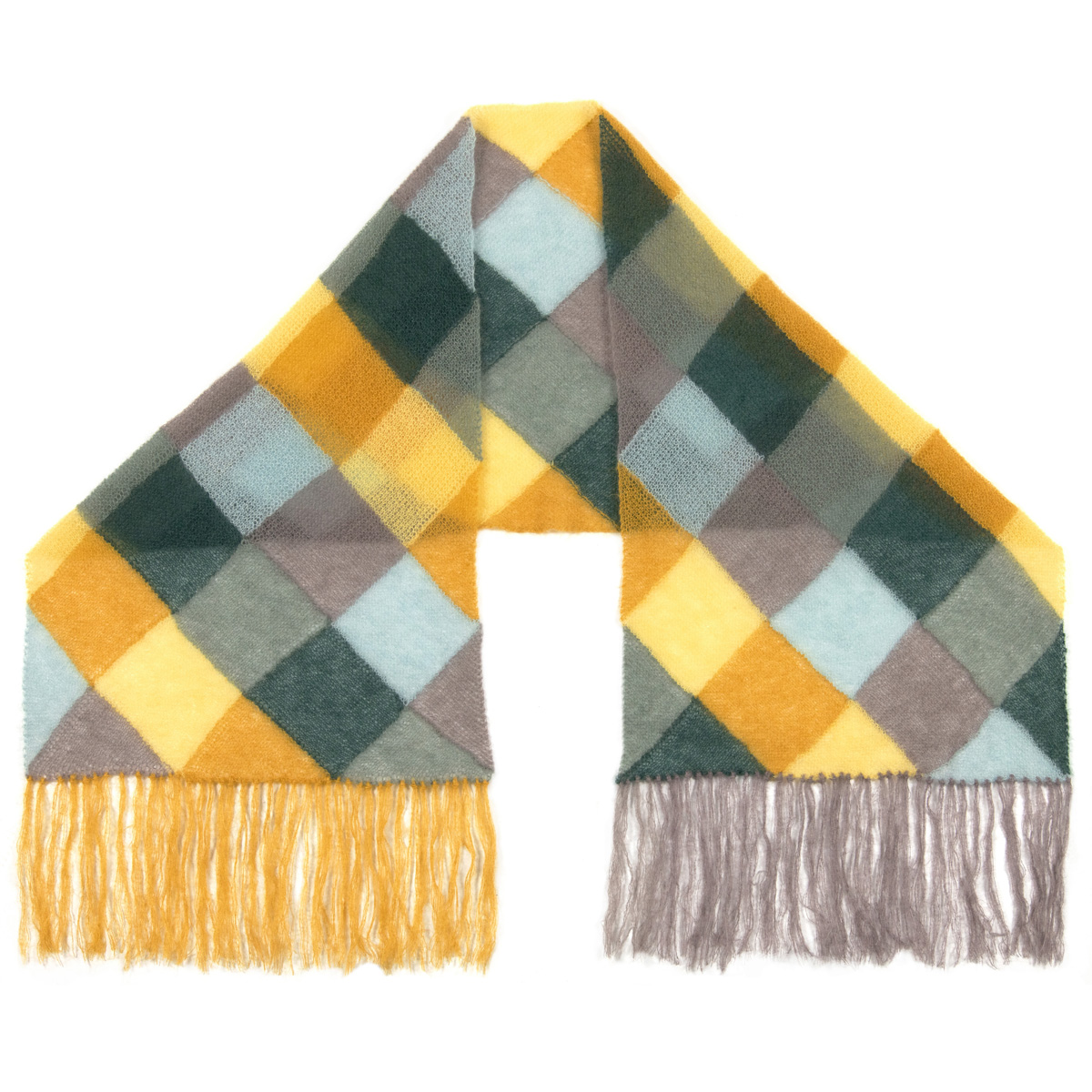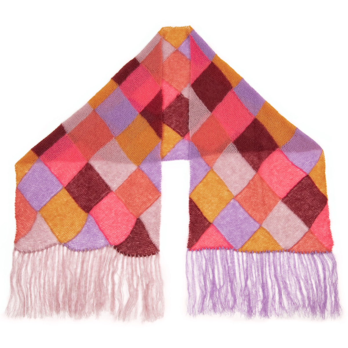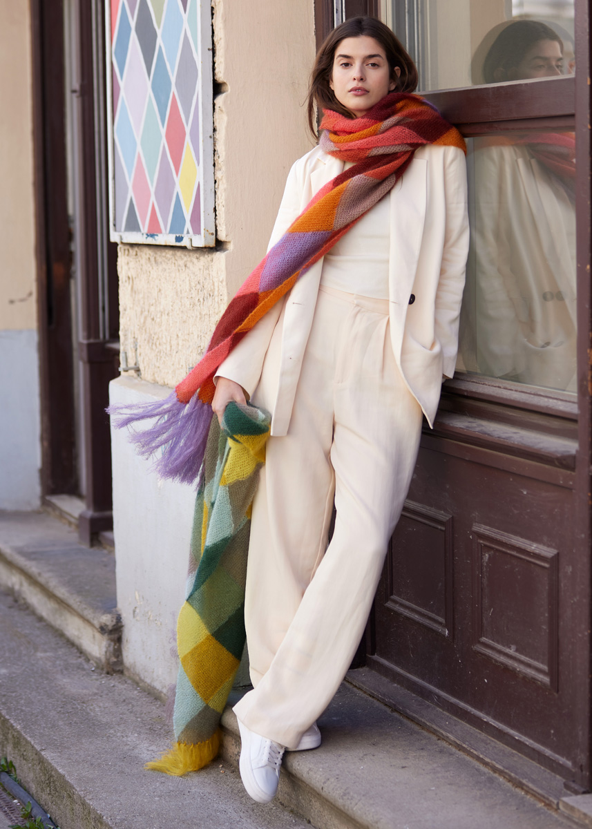 Lana Grossa Silkhair (70% mohair (superkid), 30% silke, löplängd 210 m/25 g), 16a: 50 g gammalrosa (färg 174), 50 g lavendel (färg 163), 25 g bordeaux (färg 113), 25 g tegelröd (färg 164), 25 g mandarin (färg 161) och 25 g hallon (färg 70); 16b: 50 g taupe (färg 35), 50 g curry (färg 160), 25 g grågrön (färg 105), 25 g mint (färg 175), 25 g gul (färg 158) och 25 g mörk grön (färg 110); stickor nr. 4,5, 3 maskuppsamlare, 1 virknål nr. 4,5 – 5 till fransarna.