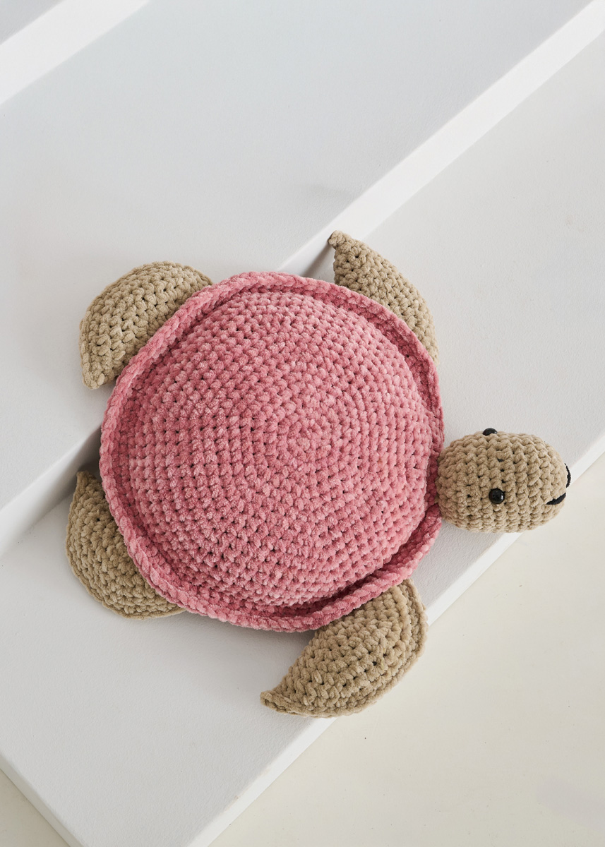 Lana Grossa The Look (100% polyester; løpelengde = 120 m/100 g): hver 100 g gammelrosa (farge 4), beige (farge 23), nougat (farge 12) og svart (farge 13); 1 heklenål nr. 7; sikkerhetsøyne med 15 mm Ø; et rundt puteinnlegg med 30 cm Ø; fyllvatt.