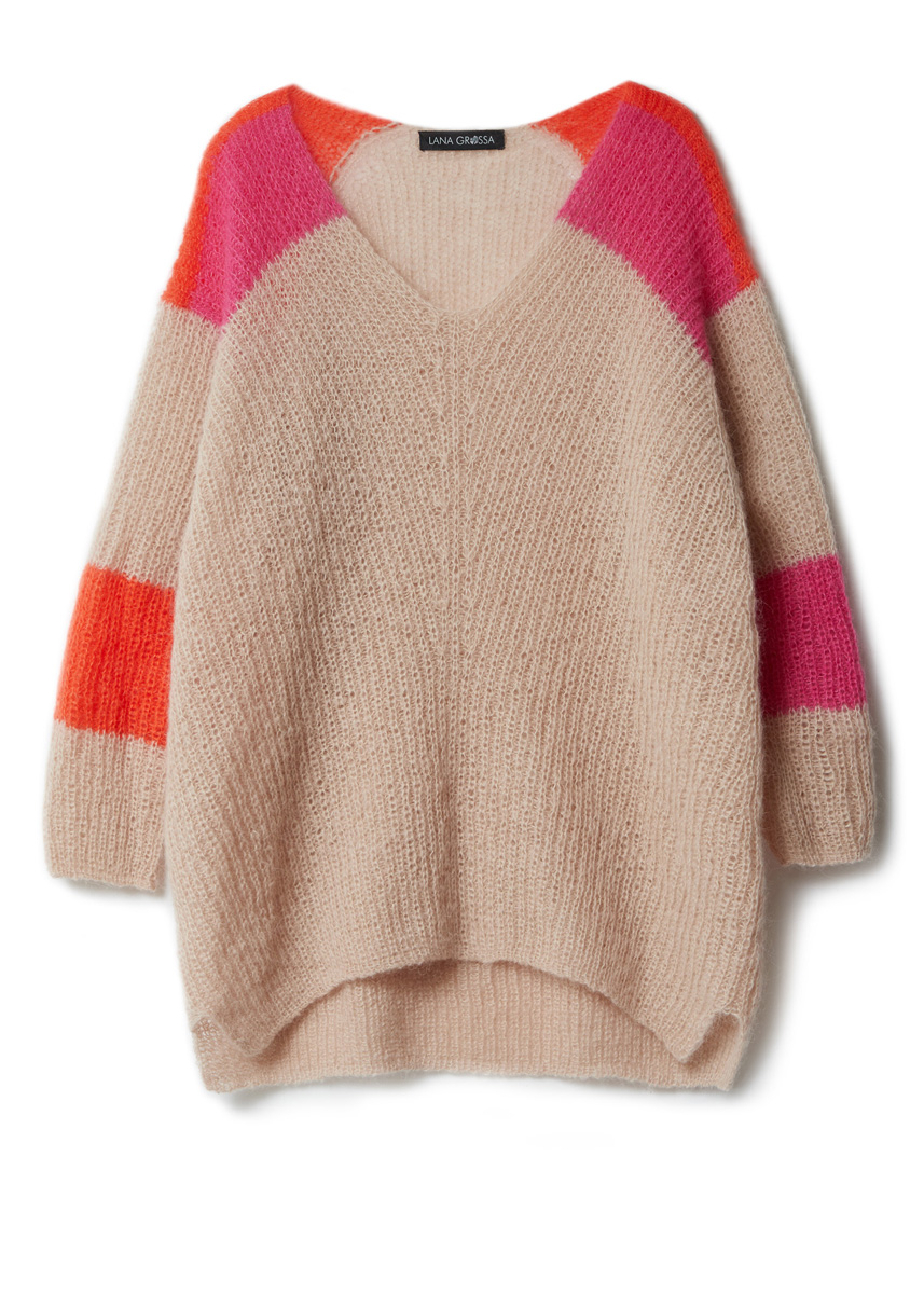 Materiale: Lana Grossa-kvalitet ”Setasuri” (69 % alpaka (suri), 31 % silke, løbelængde = ca. 212 m / 25 gr.): ca. 125(150-150-175- 200-200) gr beige (fv 21 = farve A), 25(25-25-50-50-50) gr hummer (fv 23 = farve B) og 25(25-25-50-50- 50) gr pink (fv 24 = farve C), rundpind nr. 3½, 80 cm, strømpepinde nr. 3½, hæklenål nr. 3, maskemarkører, 2 maskeholdere, stoppenål, saks.