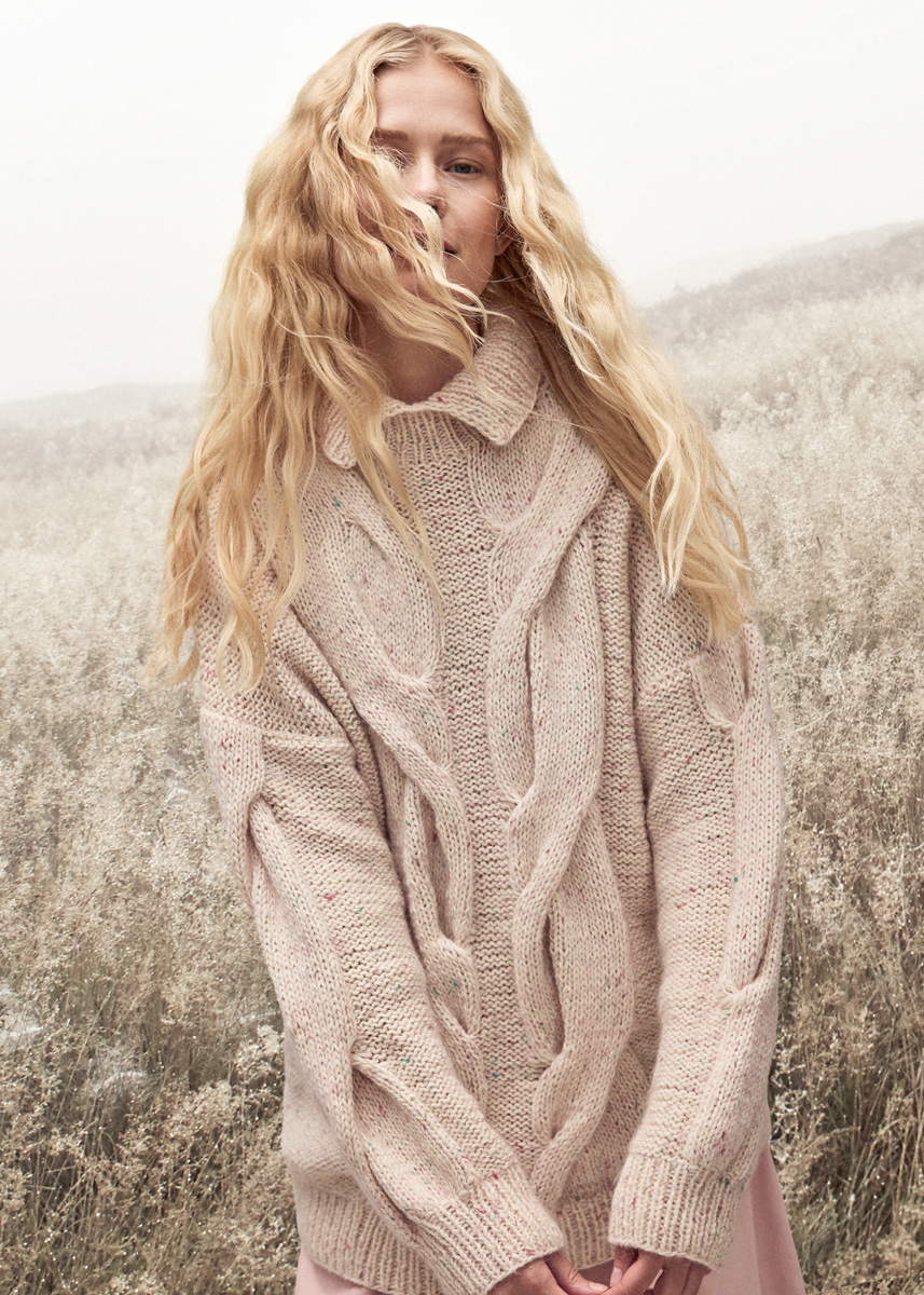 Garn: Lana Grossa Ecopuno (72 % bomull, 17 % ren ny ull (merino), 11 % alpakka (baby), LL = 215 m/50 g): 650 (700 / 750 / 800) g Ecru (frg 46) og Lana Grossa Natural Superkid Tweed (60 % mohair (superkid), 30 % silke, 7 % bomull, 3 % polyester, LL = 200 m/25 g): 175 (175 / 200 / 200) g rosé (frg 629). Pinner: Rundpinne 5,5 og 6 mm, 80–100 cm lang, rundpinne 5,5 mm, 40 cm lang (bortfaller om det strikkes med teknikken magic loop), en flettepinne.