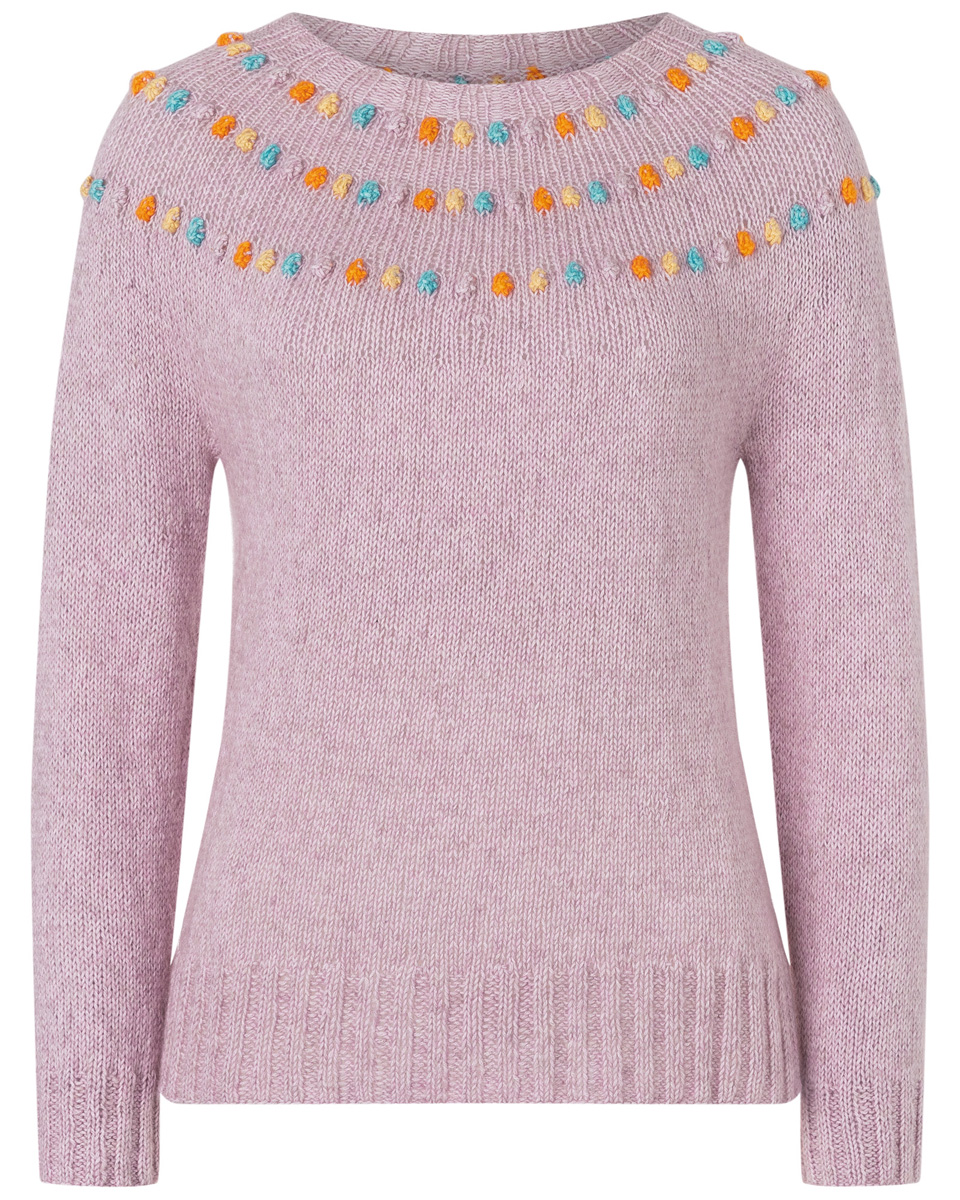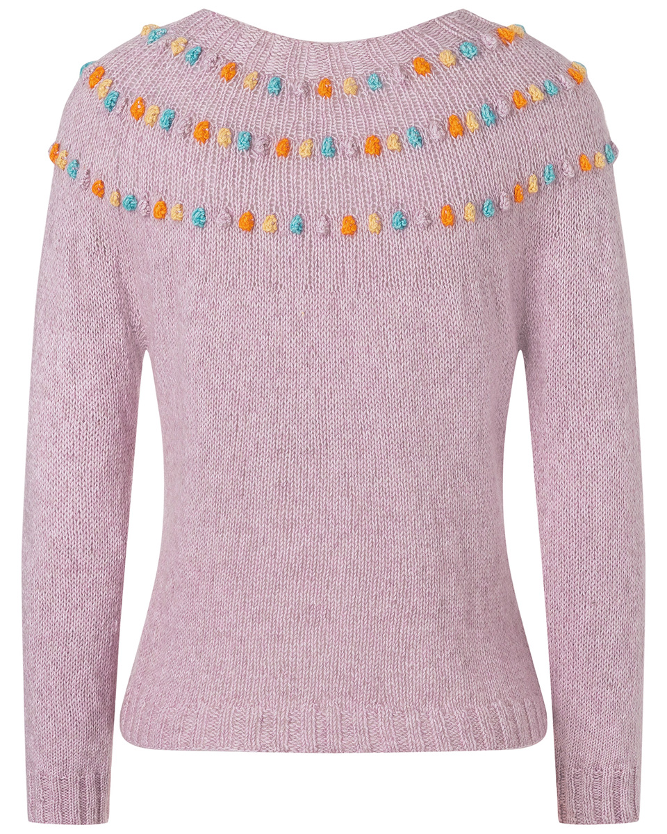 Lana Grossa-kvalitet ”Ecopuno” (72 % bomuld, 17 % ren ny uld (merino), 11 % (baby) alpaka, løbelængde = ca. 215 m / 50 gr.): 300(300)350(350)400(400)450(500) gr i farve 8 syren (hovedfarve hf) 50 gr, alle str. i farve 61 elfenbensgul (kontrastfarve 1 kf1) 50 gr, alle str. i farve 72 mandarin (kontrastfarve 2 kf2) 50 gr, alle str. i farve 28 turkis (kontrastfarve 3 kf3)