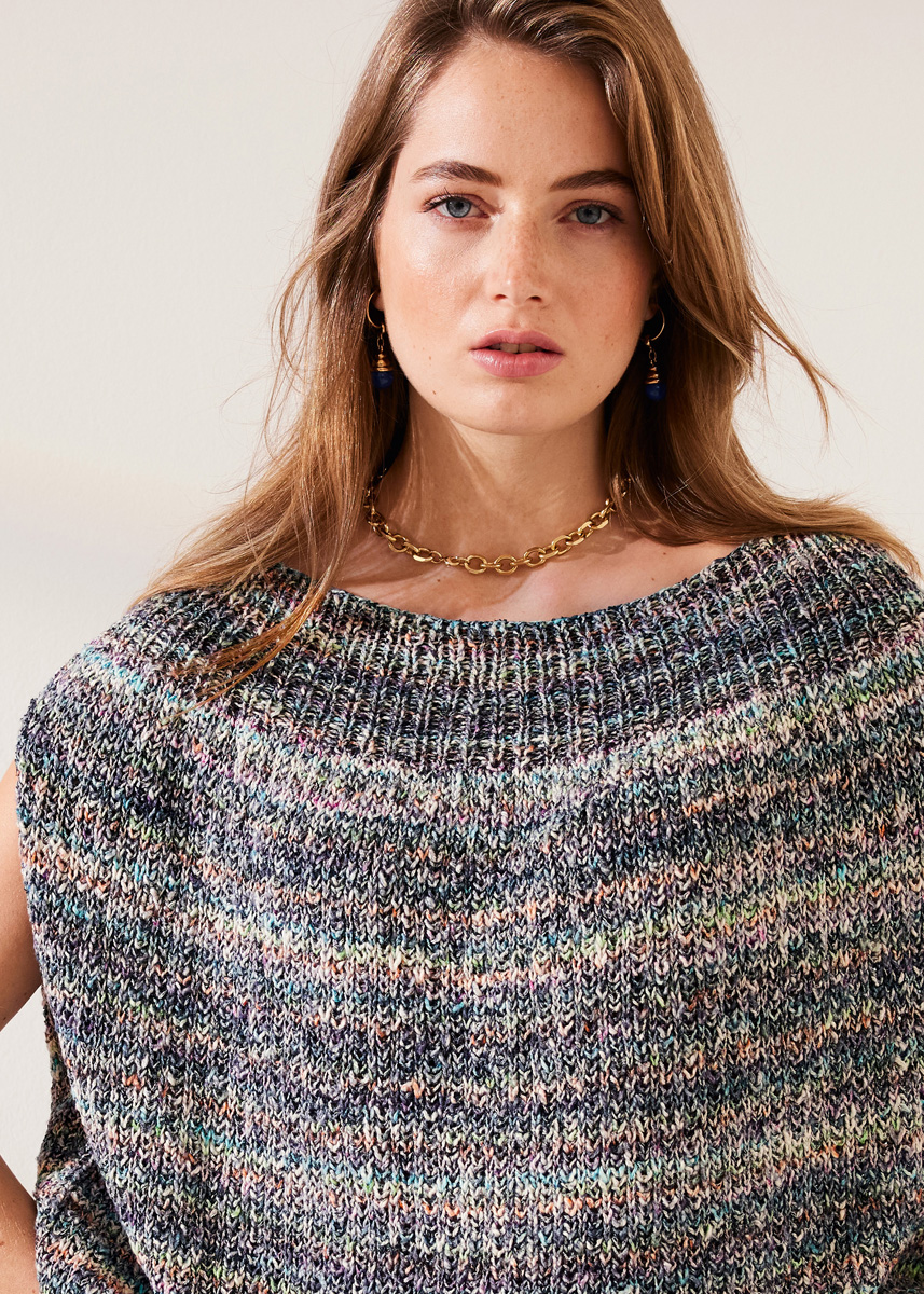 Lana Grossa-kvalitet „About Berlin Vanity” (54 % bomull, 21 % viskos, 13 % silke, 12 % polyamid, löplängd = ca. 100 m/50 g): ca. 450 g svart/turkos/petrol/gul/pink färgglad (färg 13); stickor nr. 3,5 och nr. 4, 1 rundsticka nr. 3,5, 60 cm lång.
