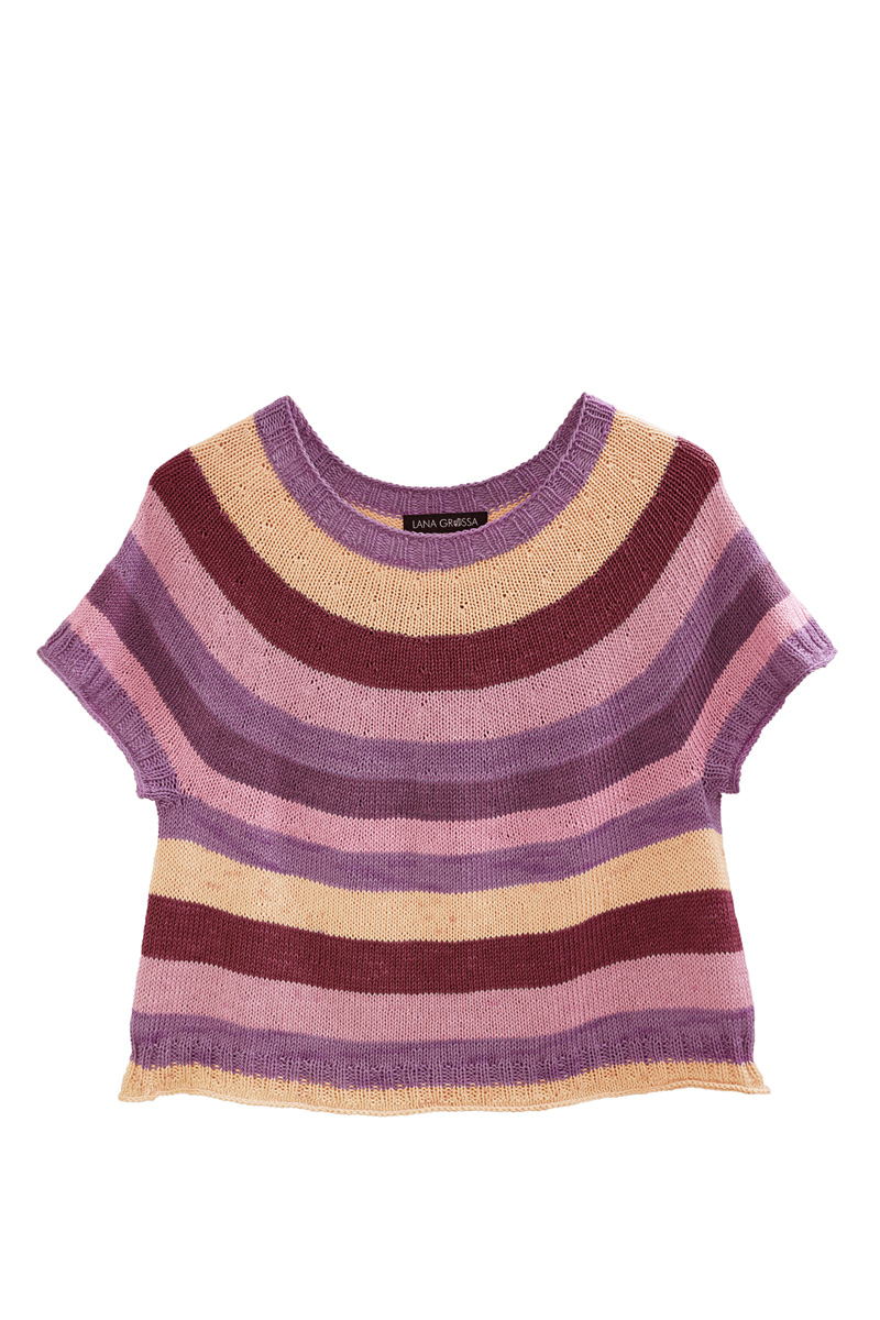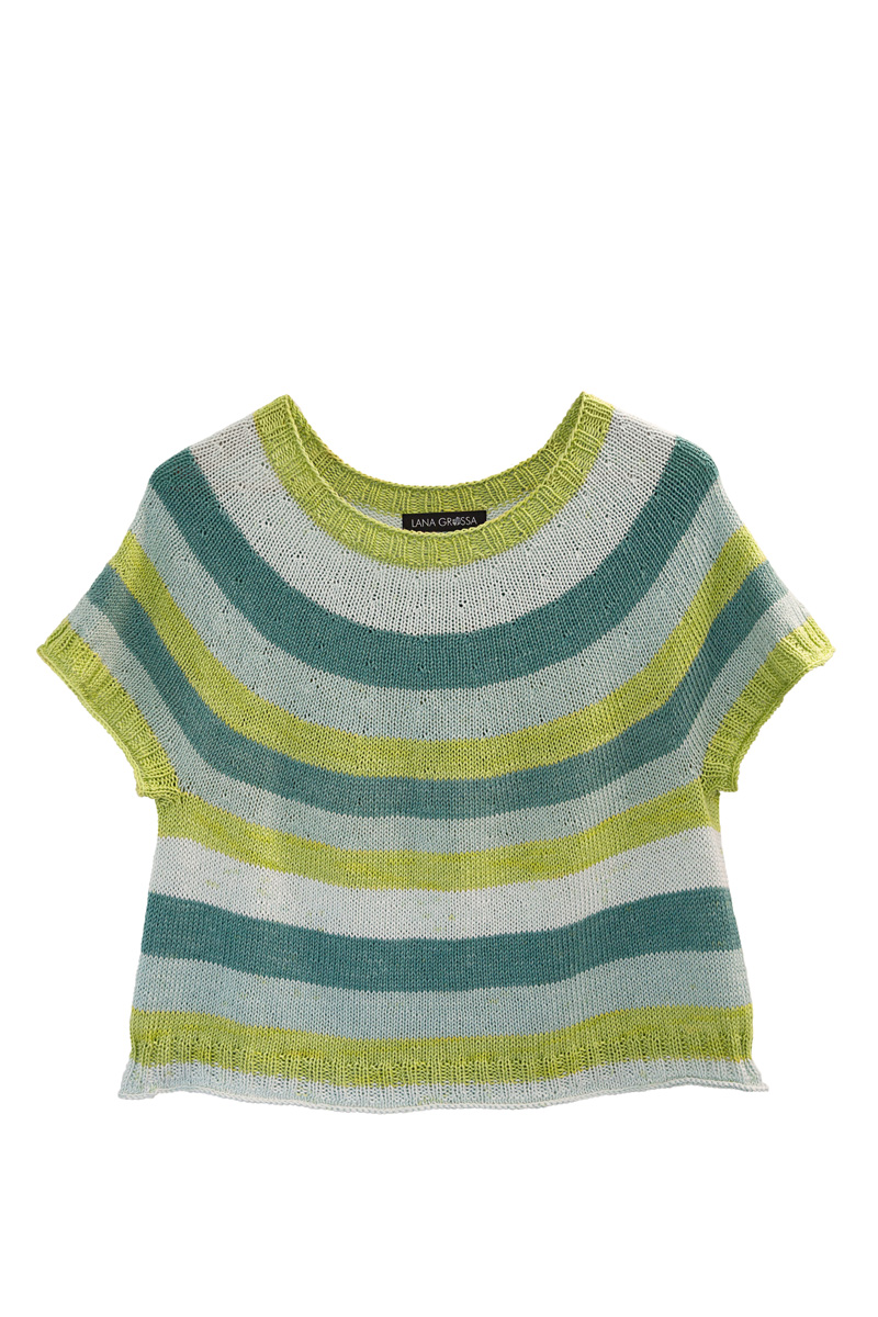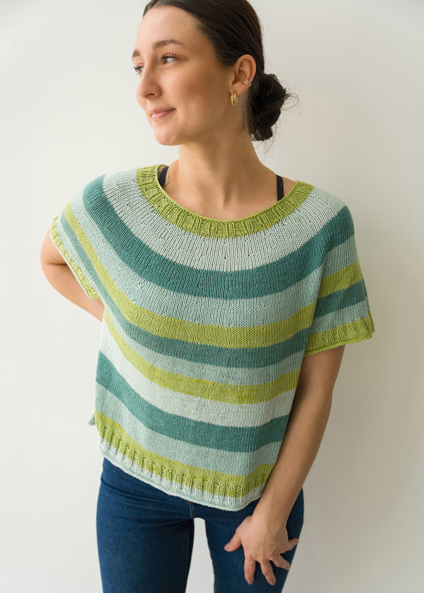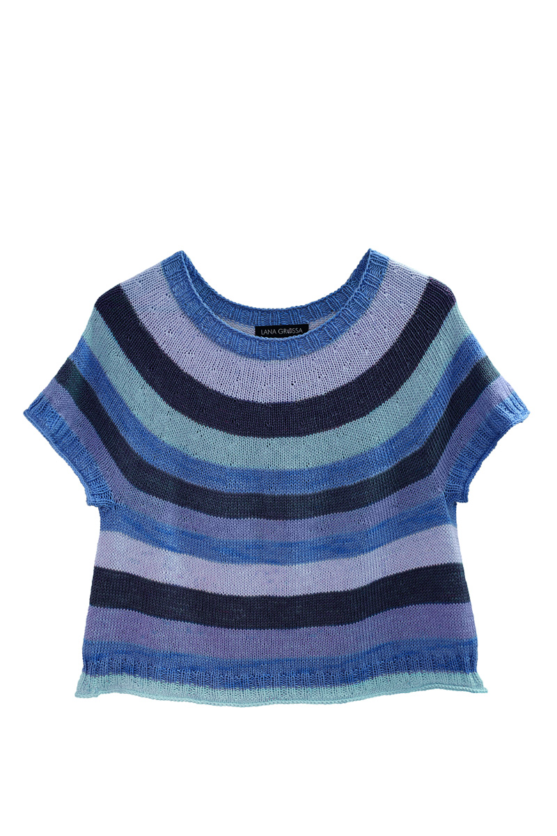 Lana Grossa-kvalitet „Bamboo“ (50 % viskos (bambu), 50 % bomull, löplängd = ca 360 m/100 g): ca 200 (300 - 300 - 400) g mint/ljuspetrol/isblå/gulgrön (färg 3014); kort och lång rundsticka nr. 3,5. T-Shirten stickas i ett stycke, uppifrån och ned.