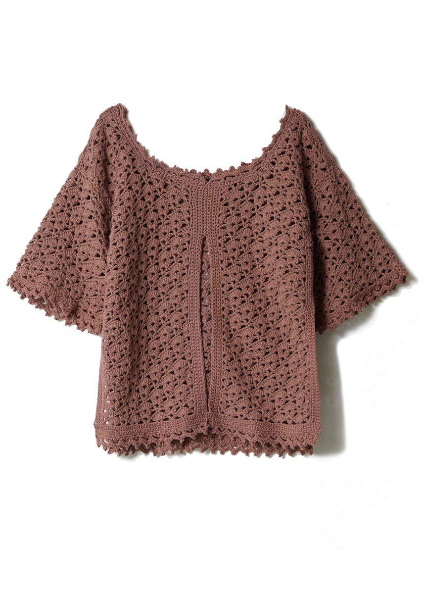 Lana Grossa Brigitte No. 4 (80% bomull, 20% alpacka (baby), löplängd 110 m/50 g), 550 (600 – 650) g kanelbrun (färg 32); 1 virknål nr. 4.