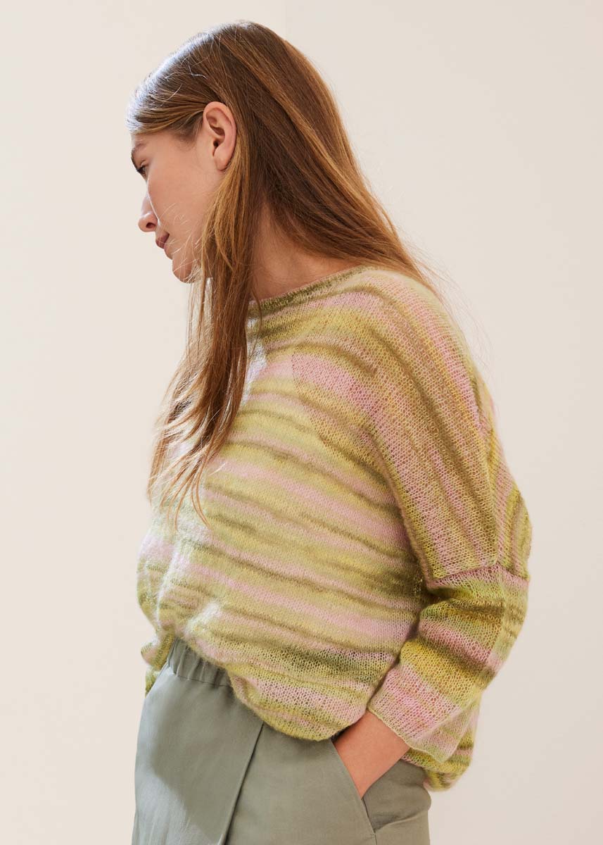 Lana Grossa-kvalitet „Cottonhair“ (70 % mohair (superkid), 30 % bomull, löplängd = ca 450 m/50 g): ca 100 (150 - 150 - 150) g vanilj/rosa/gammalrosa/mörk oliv/lindgrön (färg 108); stickor nr. 3,5 och nr. 4; 1 kort rundsticka nr. 3,5.