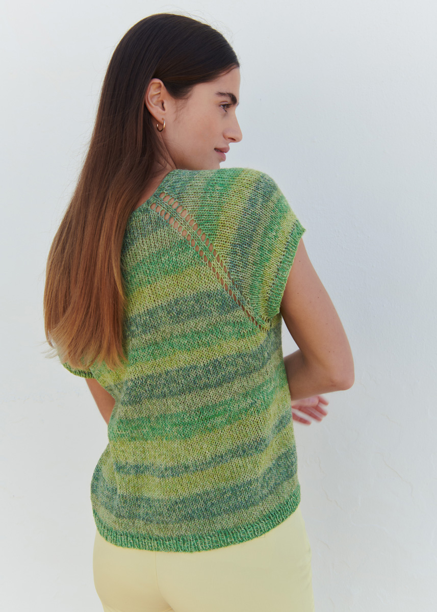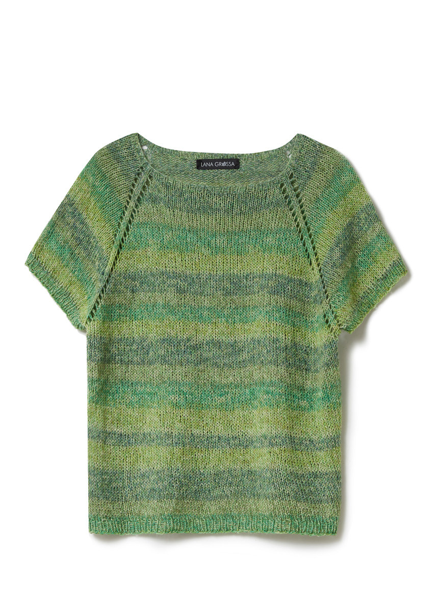 Lana Grossa „Diversa Print“ (74 % bomull, 26 % viskos, löplängd 210 m/50 g), 150 (200 – 200 – 200) g oliv/grön/gulgrön/skogsgrön/grågrön (färg 107); rundsticka nr. 3,5, 40 och 80 cm lång, rundsticka nr. 5,5 i olik längder från 40 till 80 cm, 4 maskmarkörer. Tips:T-shirten stickas runt. uppifrån och ned.