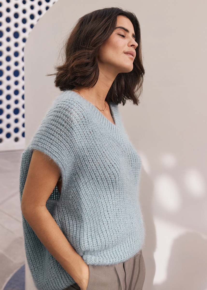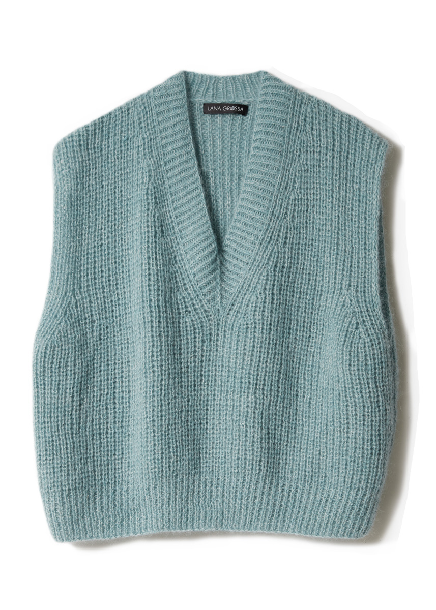 Lana Grossa „Ecopuno“ (72% bomull, 17% ren ny ull (merino), 11% alpacka (baby), löplängd 215 m/50 g), 250 (300 – 350) g mintturkos (färg 44) och Lana Grossa „Silkhair“ (70% mohair (superkid), 30% silke, löplängd 210 m/25 g), 125 (150 – 175) g mint (färg 175); stickor nr. 3,5 och 4, 1 rundsticka nr. 3,5, 40 cm lång.