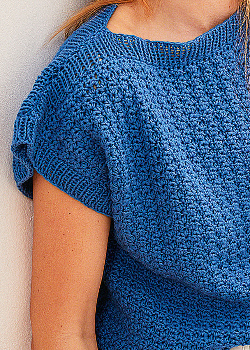 Lana Grossa-kvalitet „Landlust bomull“ (100% (bio) bomull, löplängd ca. 115 m/50 g), 400 (450 - 450 - 500) g i blå (färg 12); virknål nr. 5, rundsticka nr. 4,5, 50 cm och 80 cm långa.