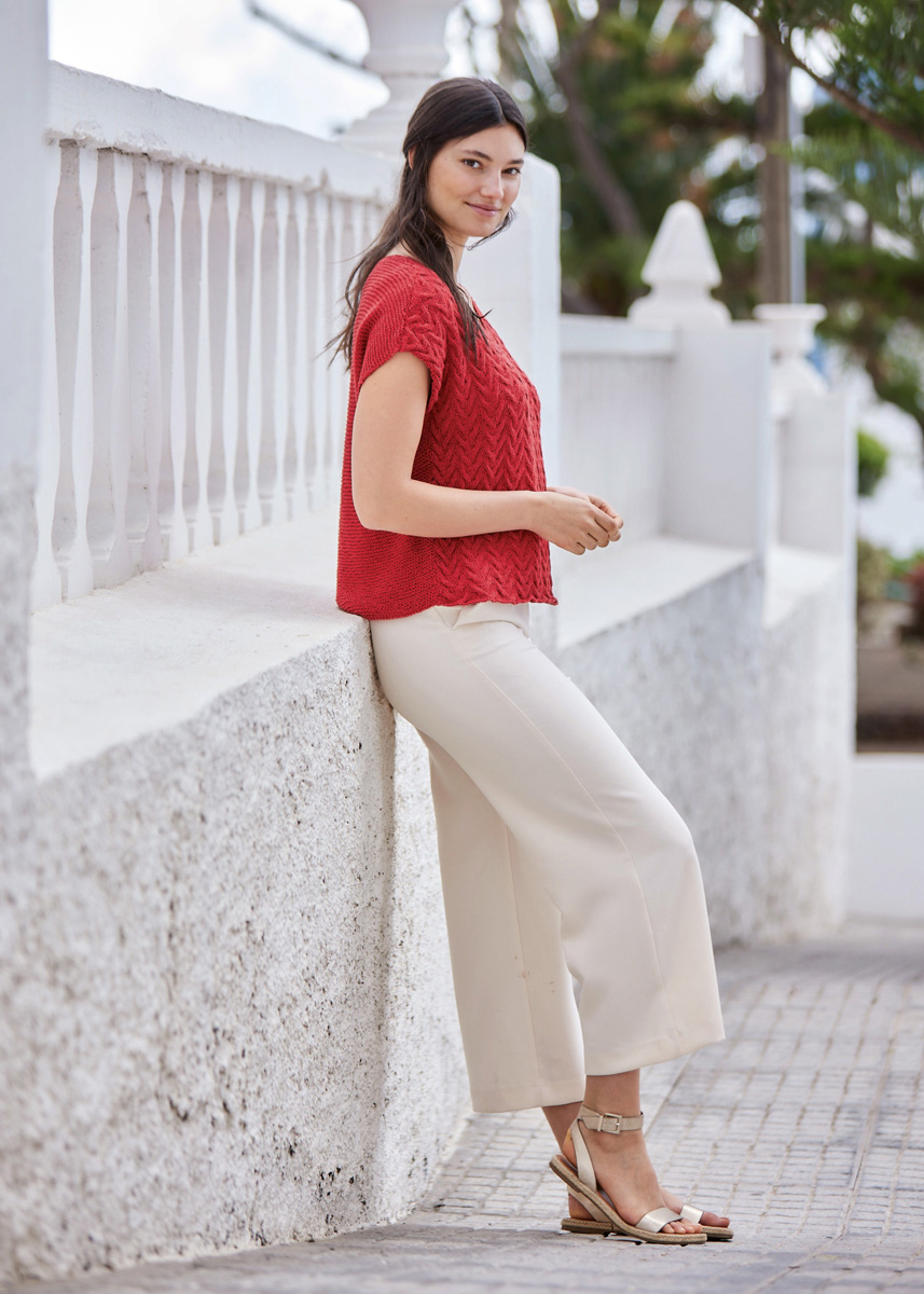 Lana Grossa-kvalitet „Landlust Sommerseide“ (50% silke, 50% bomull, löplängd ca. 170 m/50 g), 300 (350 - 400 - 450) g i röd (färg 11); stickor nr. 4, 1 hjälp- eller flätsticka, 1 virknål nr. 3,5.