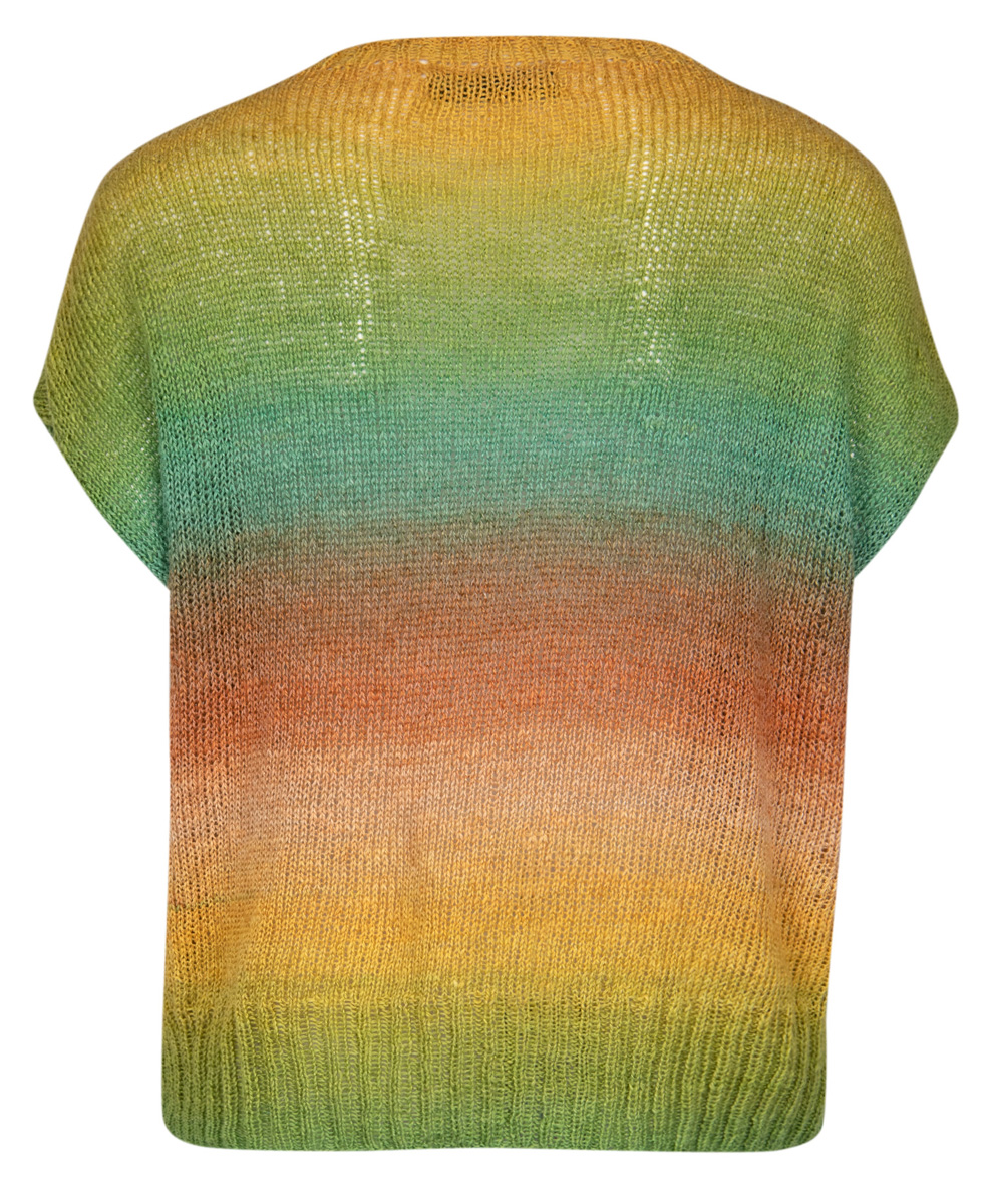 Lana Grossa-kvalitet „Mare” (50 % lin, 33 % silke, 17 % bomull, löplängd = ca. 330 m/100 g): ca. 300 (300 – 400) g ljus oliv/senapsgul/solgul/persika/puderbrun/terracotta/jade (färg 9); stickor nr. 3 och 3,5, 1 rundsticka nr. 3, 50 cm lång.