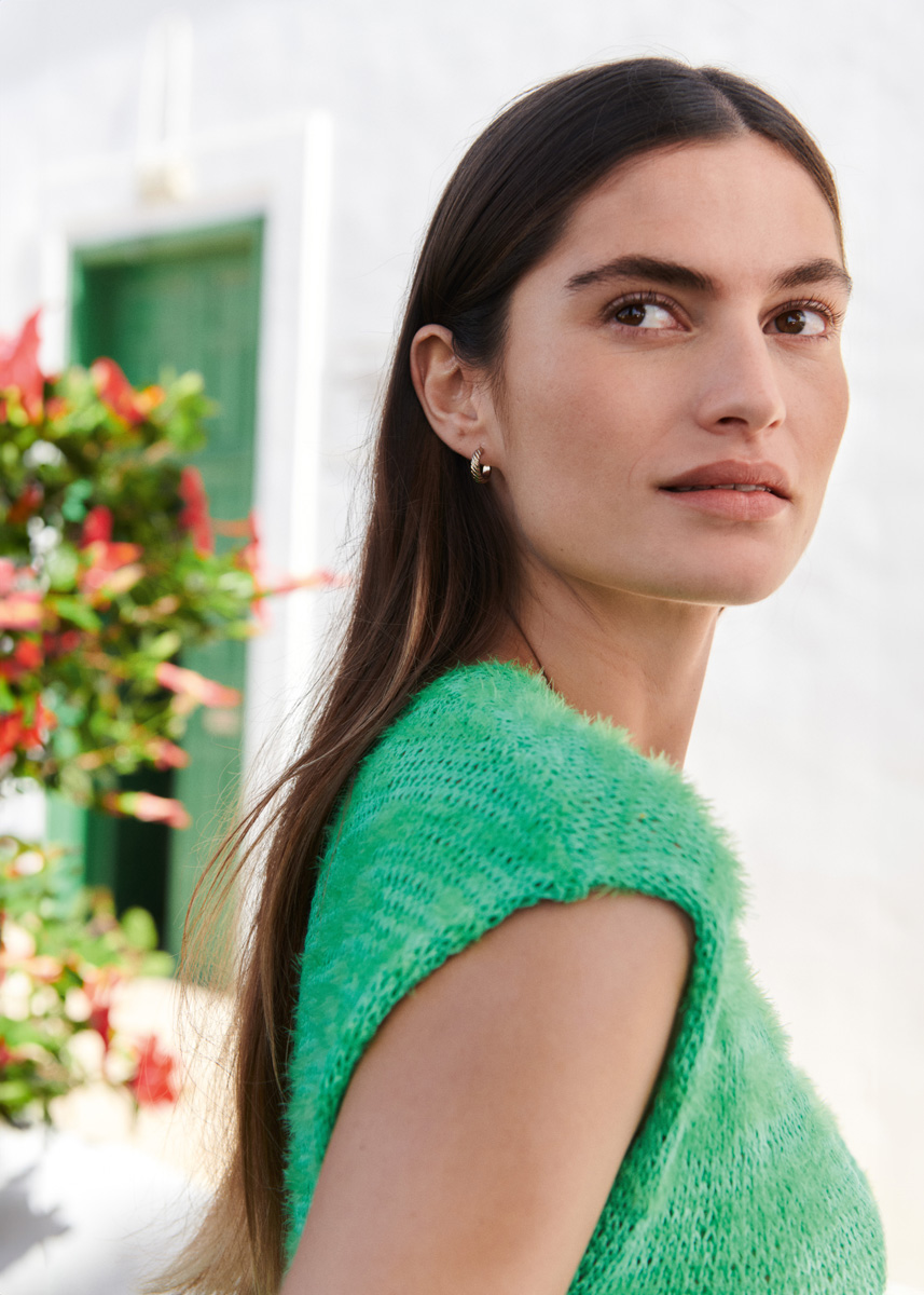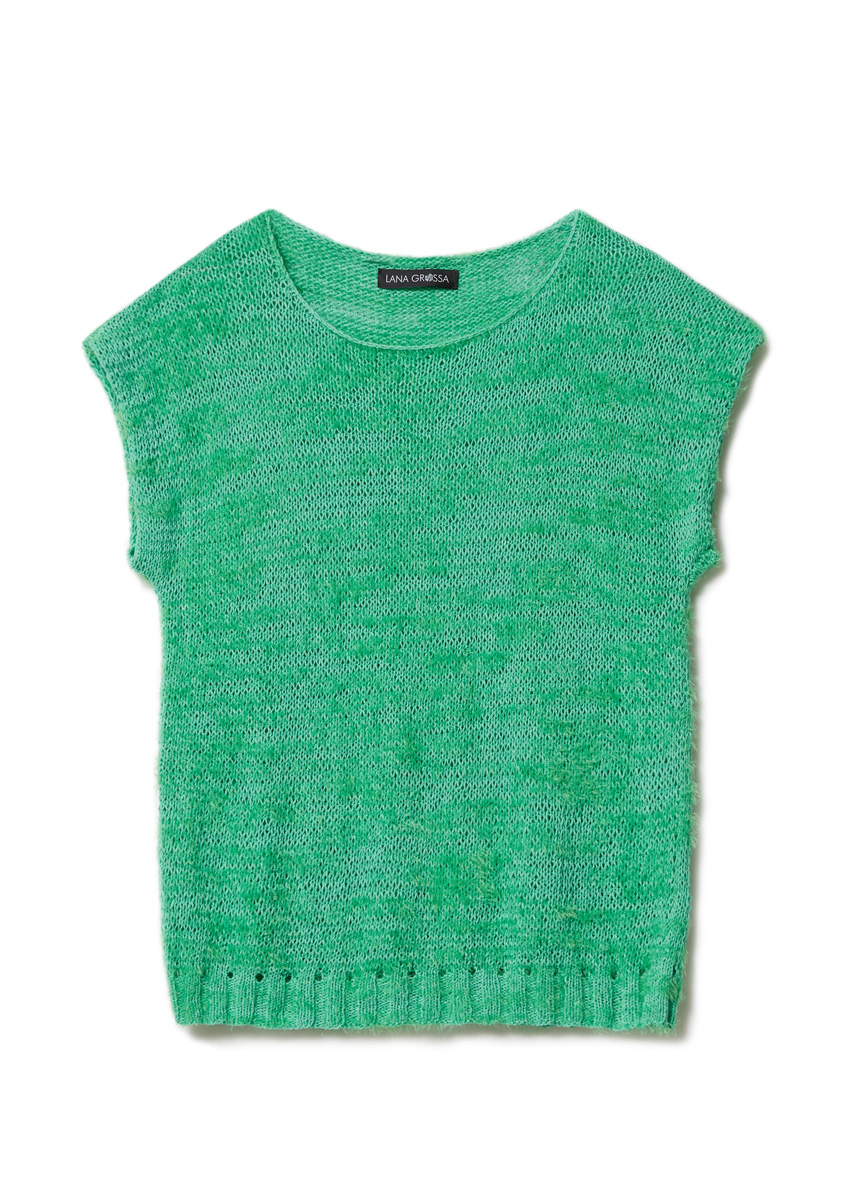 Lana Grossa „Per Tutti“ (70 % bomull, 30 % polyamid, löplängd 180 m/50 g), 200 (200 – 250 - 250) g Maigrön (färg 5); stickor nr. 3 och 6; rundsticka nr. 3, 40 cm lång.