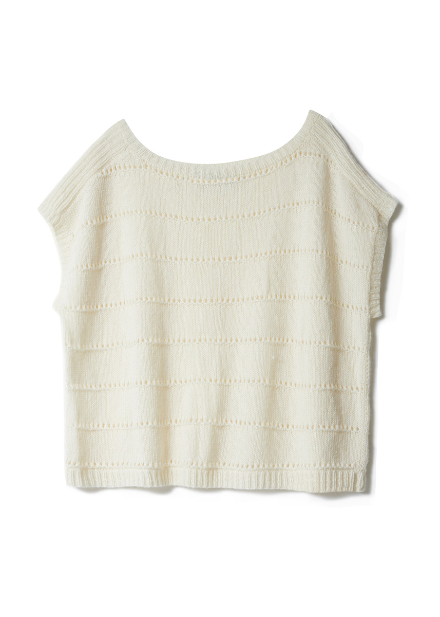 Lana Grossa „Puno Luce“ (30% alpacka (baby), 30% ren ny ull (merino), 20% polyamid, 20%, bomull, löplängd 250 m/50 g), 200 (250 – 250) g vit (färg 1); stickor nr. 2,5 och 4,5, 1 rundsticka nr. 2,5, 40 cm lång.
