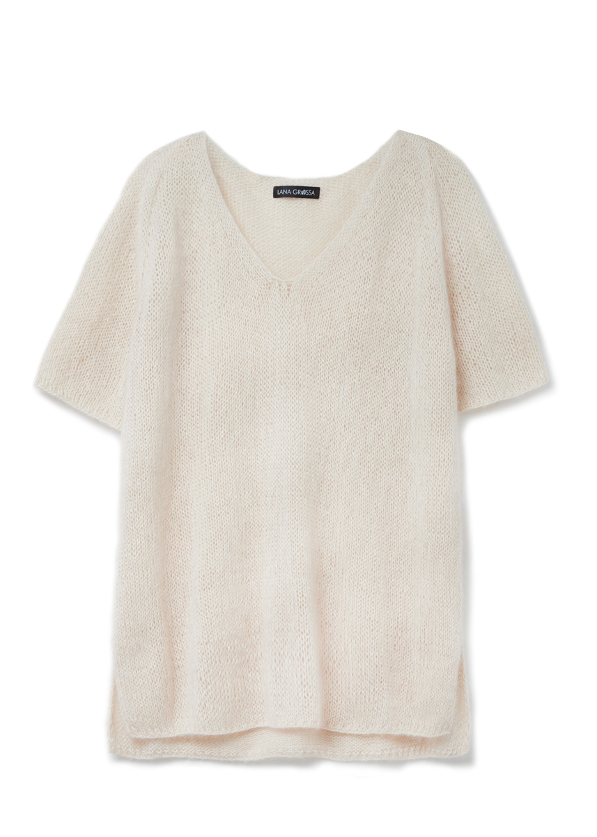Lana Grossa Setapura (100% silke, löplängd 200 m/50 g), 150 (200 – 250 – 300) g creme (färg 15) och Lana Grossa Silkhair (70% mohair (Superkid), 30% silke, löplängd 210 m/25 g), 75 (100 – 125 – 150) g mjukrosa (färg 93); rundstickor nr. 5,5, 40, 60 och 80 cm långa, virknål nr. 4, 10 maskmarkörer, flätsticka. OBS: Modellen stickas med dubbla trådar, 1 tråd Setapura och 1 tråd Silkhair!