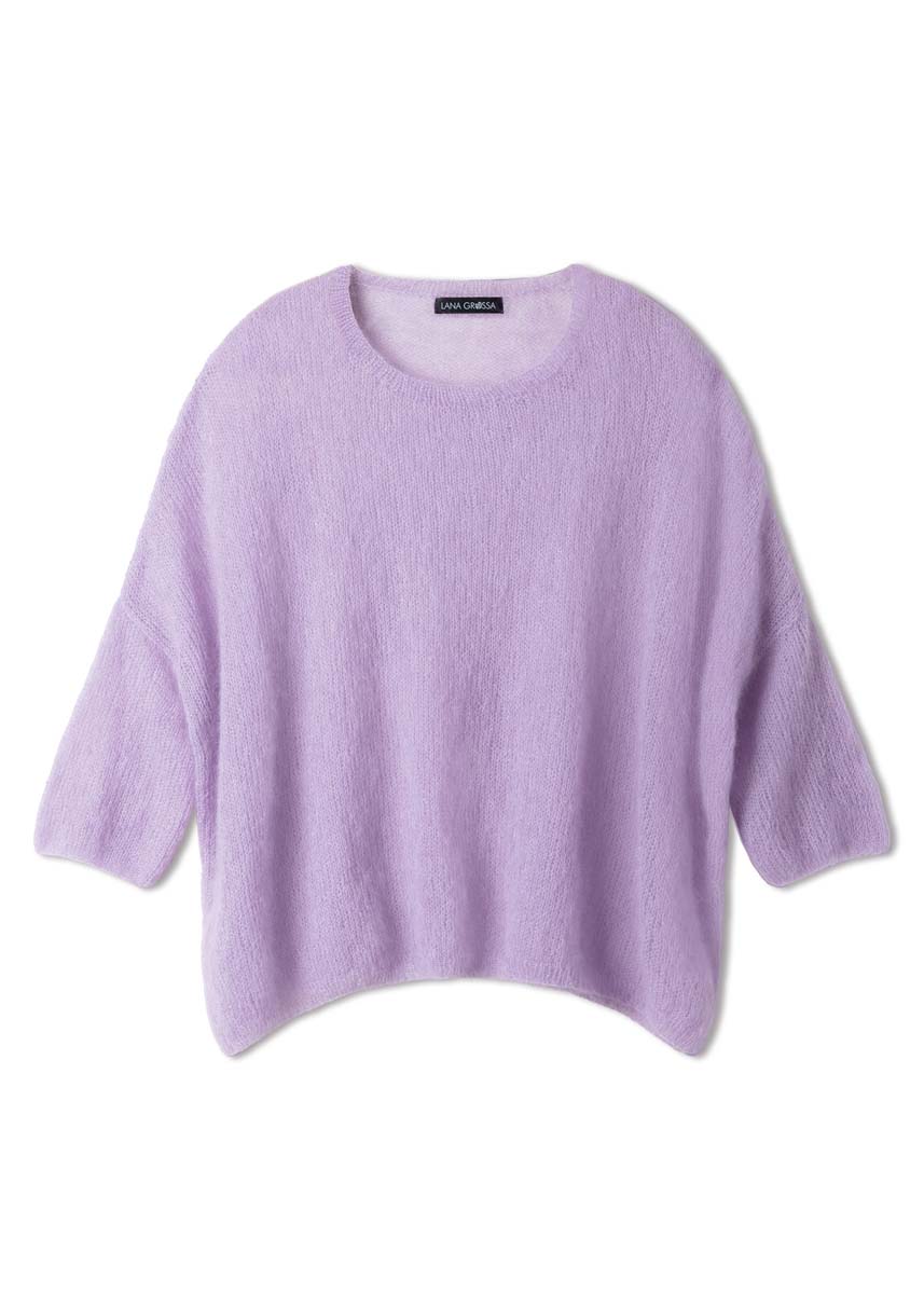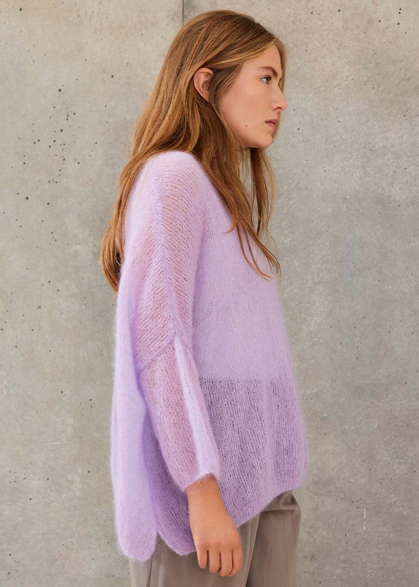 Lana Grossa-kvalitet „Silkhair“ (70 % mohair (superkid), 30 % silke, löplängd = ca 210 m/25 g): ca 125 (125 - 150 - 150) g syren (färg 173); stickor nr. 3,5 och nr. 4; 1 kort rundsticka nr. 3,5.