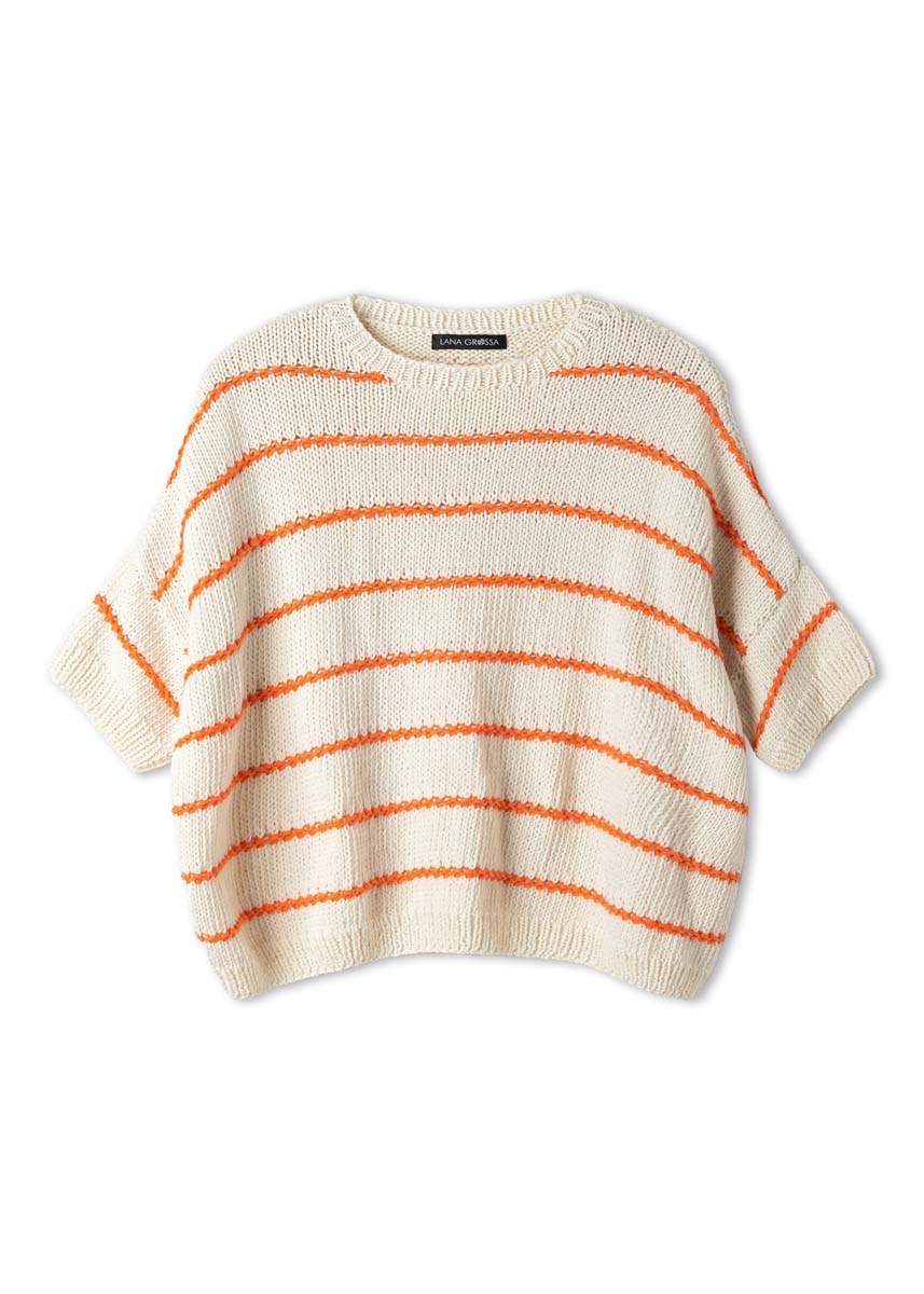 Lana Grossa-kvalitet „Summer Softness“ (80 % bomull (bio), 20 % ren ny ull (superfin merino), löplängd = ca 130 m/50 g): ca 300 (350 - 350 - 400) g creme (färg 2) och ca 50 (50 - 100 - 100) g pumpa (färg 6); stickor nr. 5 och nr. 7; 1 rundsticka nr. 5.