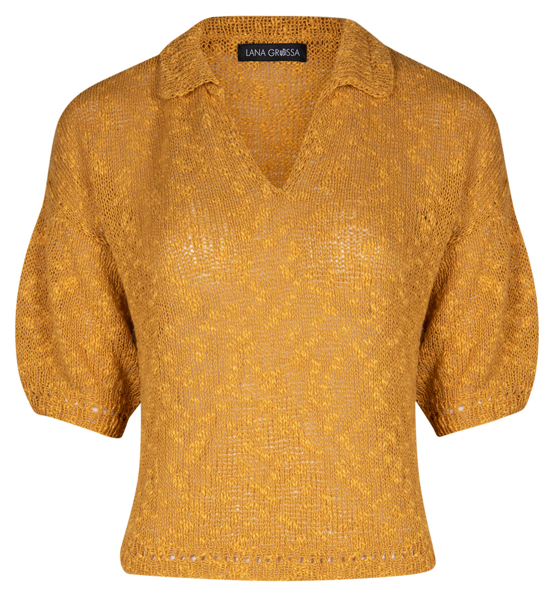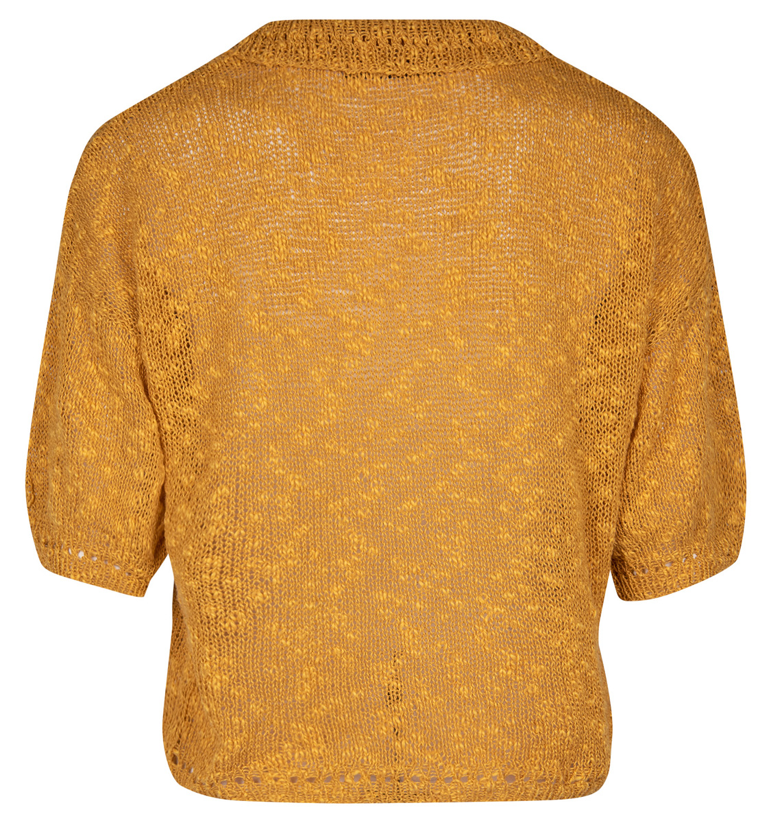 Lana Grossa-kvalitet „Terra“ (58 % rec. hør, 42 % bomuld, løbelængde = ca. 170 m / 50 gr.): ca. 250(300) gr solgul (fv 13), strikkepinde nr. 3 og 4, rundpind nr. 3, 60 cm.