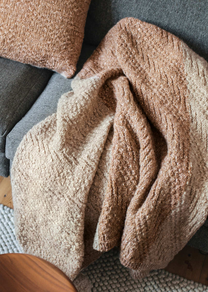 Lana Grossa-kvalitet „Brigitte No. 2 Seta“ (38 % (Baby) Alpaka, 33 % polyamid, 25 % ren ny ull (merino), 4 % silke, löplängd = ca 135 m/50 g): ca 550 g beige melerad (färg 7) och ca 150 g kamel melerad (färg 8); stickor nr. 5.