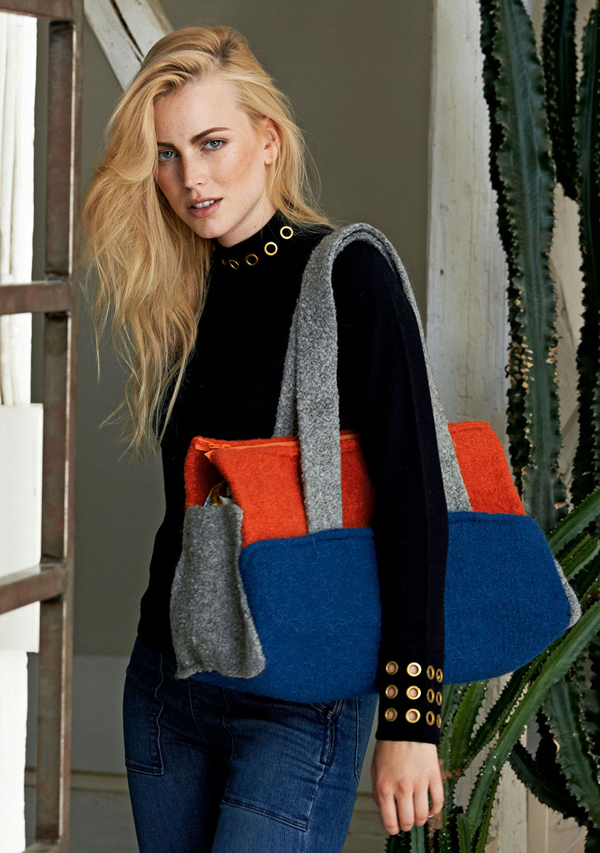 Lana Grossa Qualität „Feltro“ (100 % Schurwolle, LL = 50 m/50 g), pro Tasche je 300 g Grau meliert (Fb. 3) und Petrolblau (Fb. 40), 350 g Orangerot (Fb. 30) oder Zyklam (Fb. 62); Stricknadeln Nr. 8; teilbarer Reißverschluss in Orange oder Zyklam mit Kunststoffzähnchen, 45 cm lang; Nähnadel und Allesnäher in passender Farbe