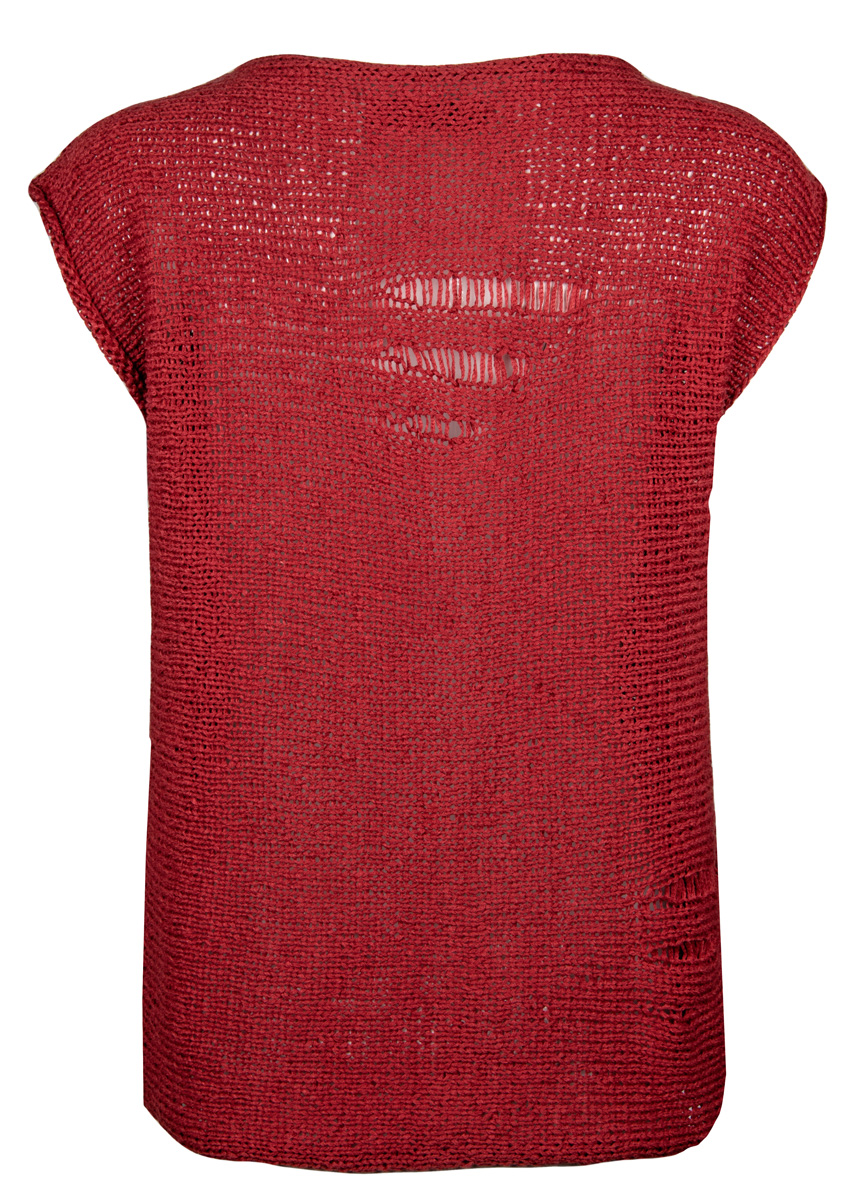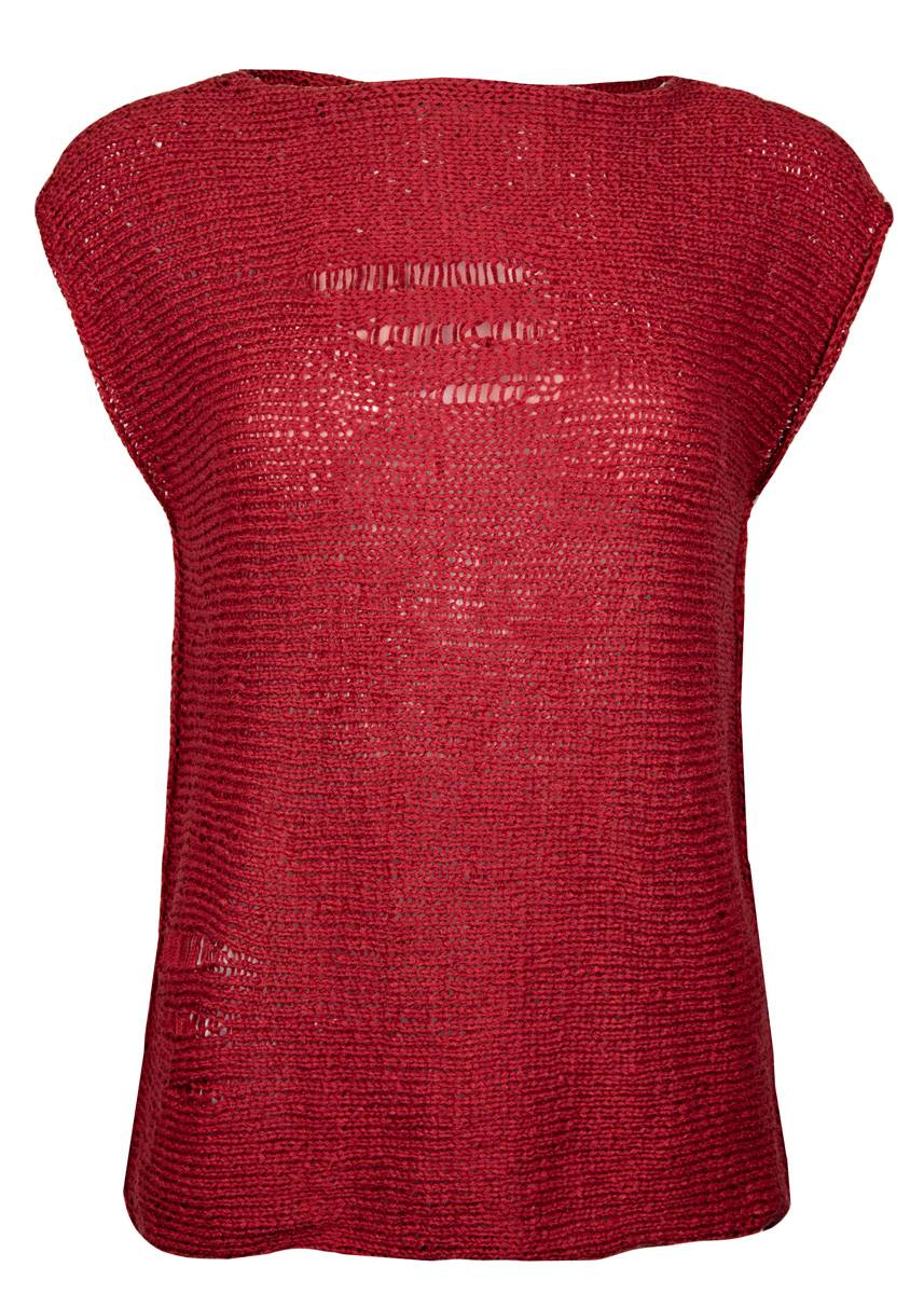 Lana Grossa-kvalitet „About Berlin Chilly” (100 % lin, löplängd = ca. 95 m/50 g): ca. 350 (400 – 450) g röd (färg 6); 1 rundsticka nr. 5, 80 cm lång, 1 virknål nr. 4.