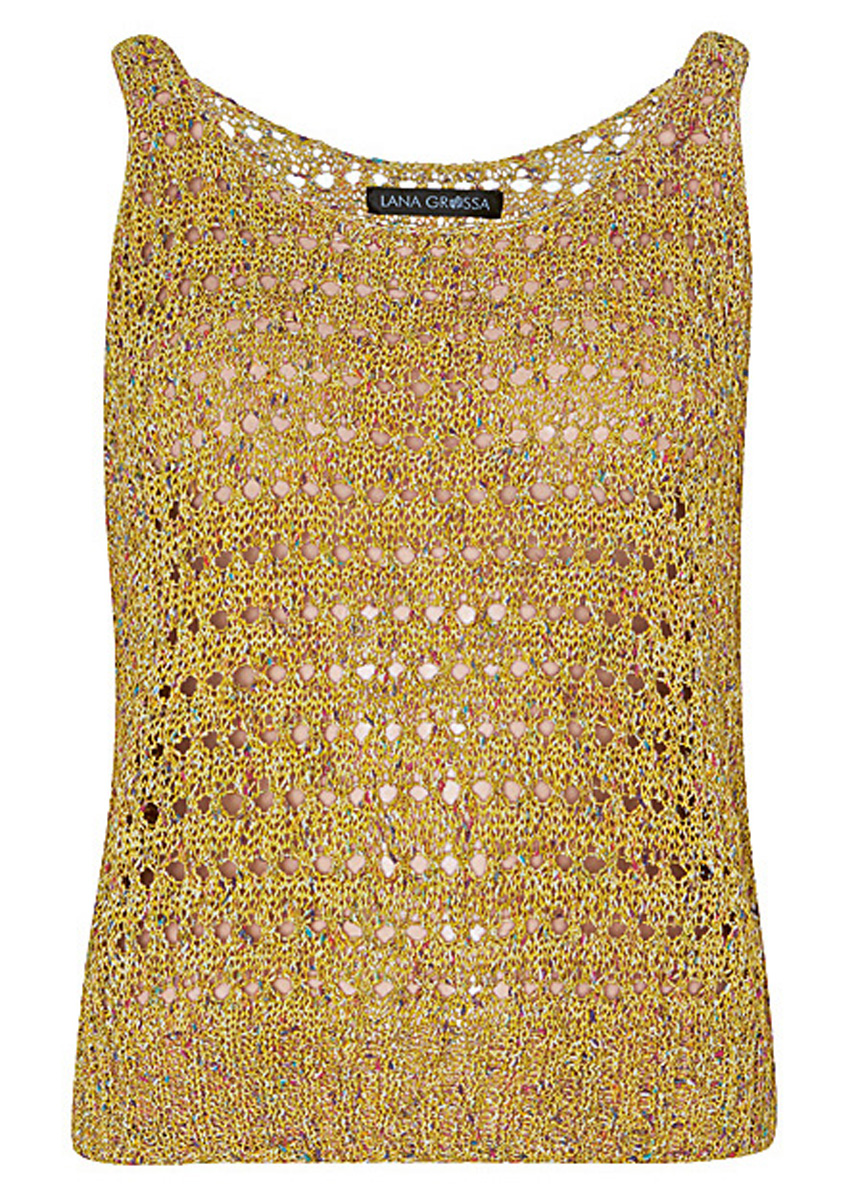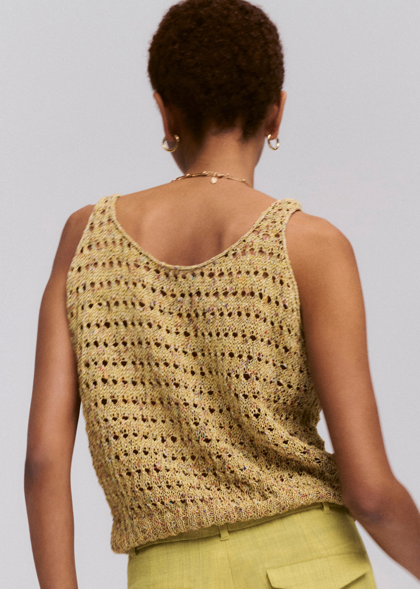 Lana Grossa-kvalitet „About Berlin Spotty“ (55 % bomull, 26 % polyamid, 19 % polyester, löplängd 125 m/50 g): ca. 250 (300) g senapsgul färgglad (färg 3); stickor nr. 3 och 4, 1 rundsticka nr. 4, 50 cm lång.