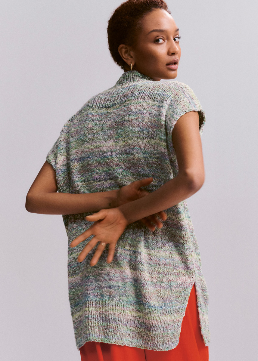 Lana Grossa-kvalitet „About Berlin Vanity“ (54 % bomull, 21 % viskos, 13 % silke, 12 % polyamid, löplängd 100 m/50 g): ca. 450 (500 – 550) g grön/jeans/pastellrosa/natur färgglad (färg 5); stickor nr. 3,5 och 5.