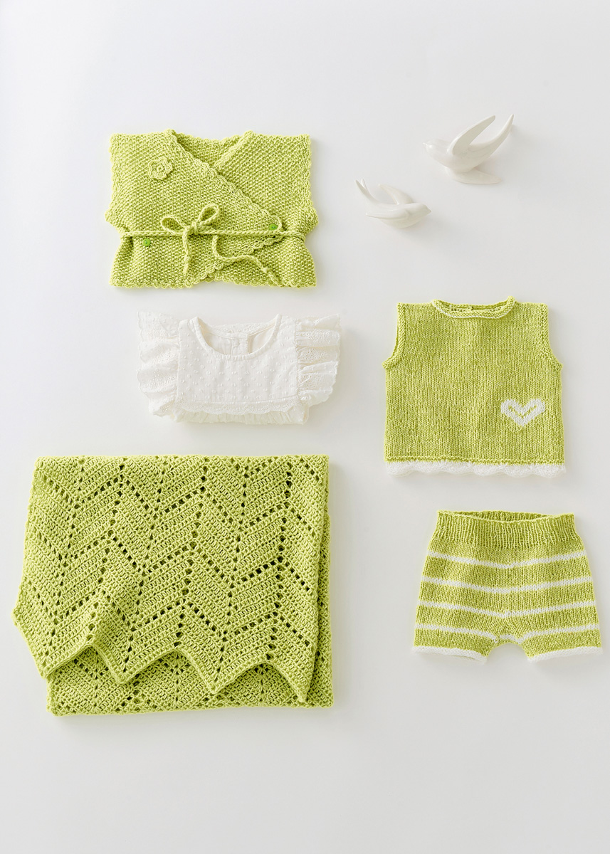 Lana Grossa-kvalitet ”Allora” (76 % bomuld, 14 % ren ny uld (merino superfine), 10 % alpaka (baby)), løbelængde = ca. 300 m / 50 gr.): 50 gr gulgrøn (fv 2) og 50 gr hvid (fv 14), strikkepinde nr. 3, rundpind nr. 3, 40 cm, hæklenål nr. 3, 1 knap, 11 mm Ø.