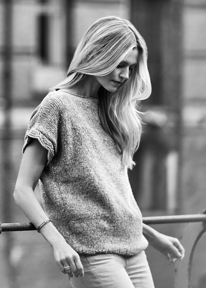 Lana Grossa Amoroso (33% ren ny ull, 32% polyacryl, 14% silke, 14% bomull, 7% polyamid, löplängd 400 m/100 g), 200 (300 – 300) g [2 (3 – 3) nystan] ljus grå/jeans/violblå/grå (färg 4); stickor nr. 6 och 1 rundsticka nr. 6, 40 cm lång.