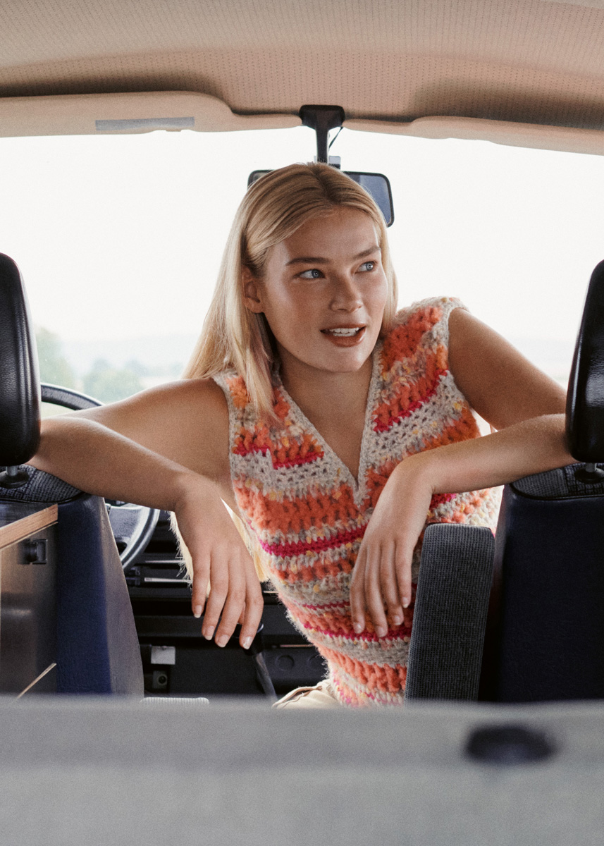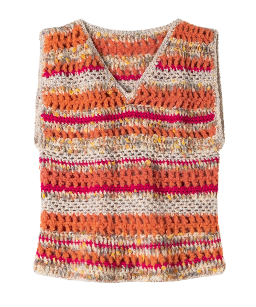 Lana Grossa Lala Berlin Brushy Print (40% ren ny ull (merino), 36% mohair (superkid), 13% polyamid, 11% bomull, löplängd 115 m/50 g), 100 (150 – 150) g mjuk gul/gul/lax/grå/gråbrun (färg 203), Lana Grossa Lala Berlin Cloudy (93% ren ny ull (merino extrafine), 7% nylon, löplängd 100 m/50 g), 100 (150 – 150) g lax (färg 3), Lana Grossa Lala Berlin Lovely Cotton (75% ren ny ull (merino superfine), 25% bomull, löplängd 90 m/50 g), 50 g pink (färg 28) och Lana Grossa Sara (65% bomull, 30% alpacka (baby), 5% ren ny ull (merino), löplängd 125 m/50 g), 50 g beige/guldgul melerad (färg 19); 1 virknål nr. 5 och 6.
