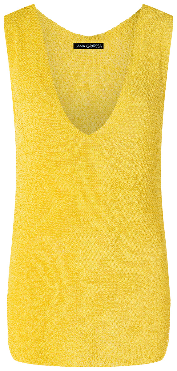 Lana Grossa-kvalitet „Capri” (55 % bomull, 30 % polyamid, 15 % silke, löplängd = ca. 150 m/50 g): ca. 250 (300) g citrongul (färg 23); stickor nr. 3.