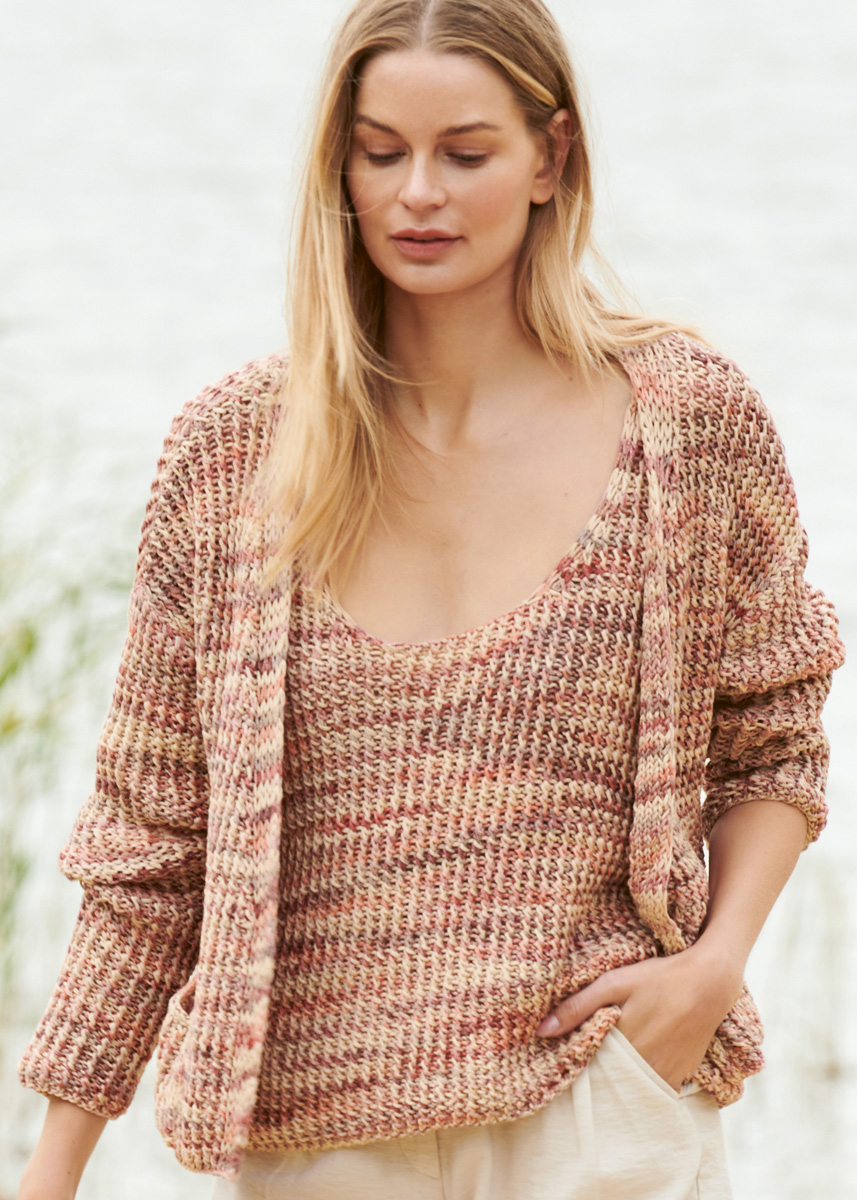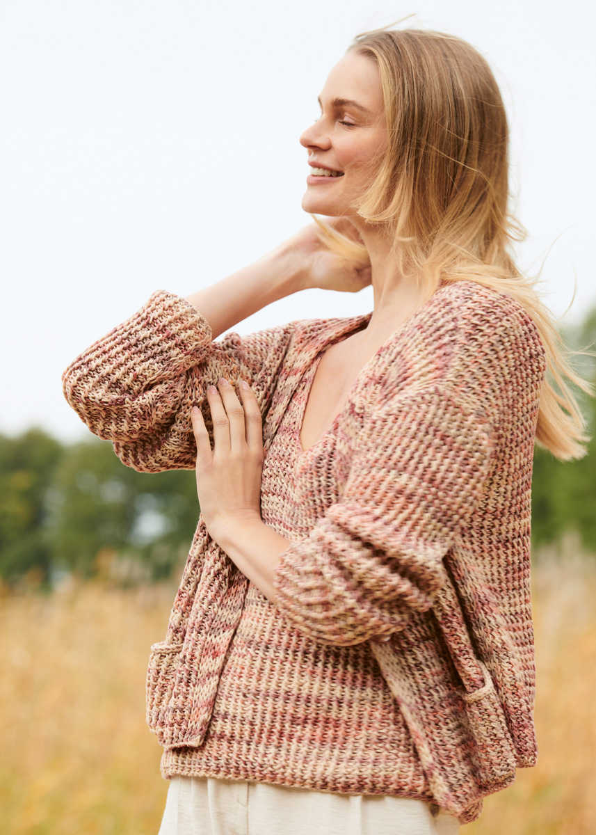 Lana Grossa-kvalitet „Certo Print” (100 % bomull, löplängd = ca. 115 m/50 g): ca. 250 (300) g beige/lax/björnbär/aubergine (färg 108); stickor nr. 6,5 och 8.
