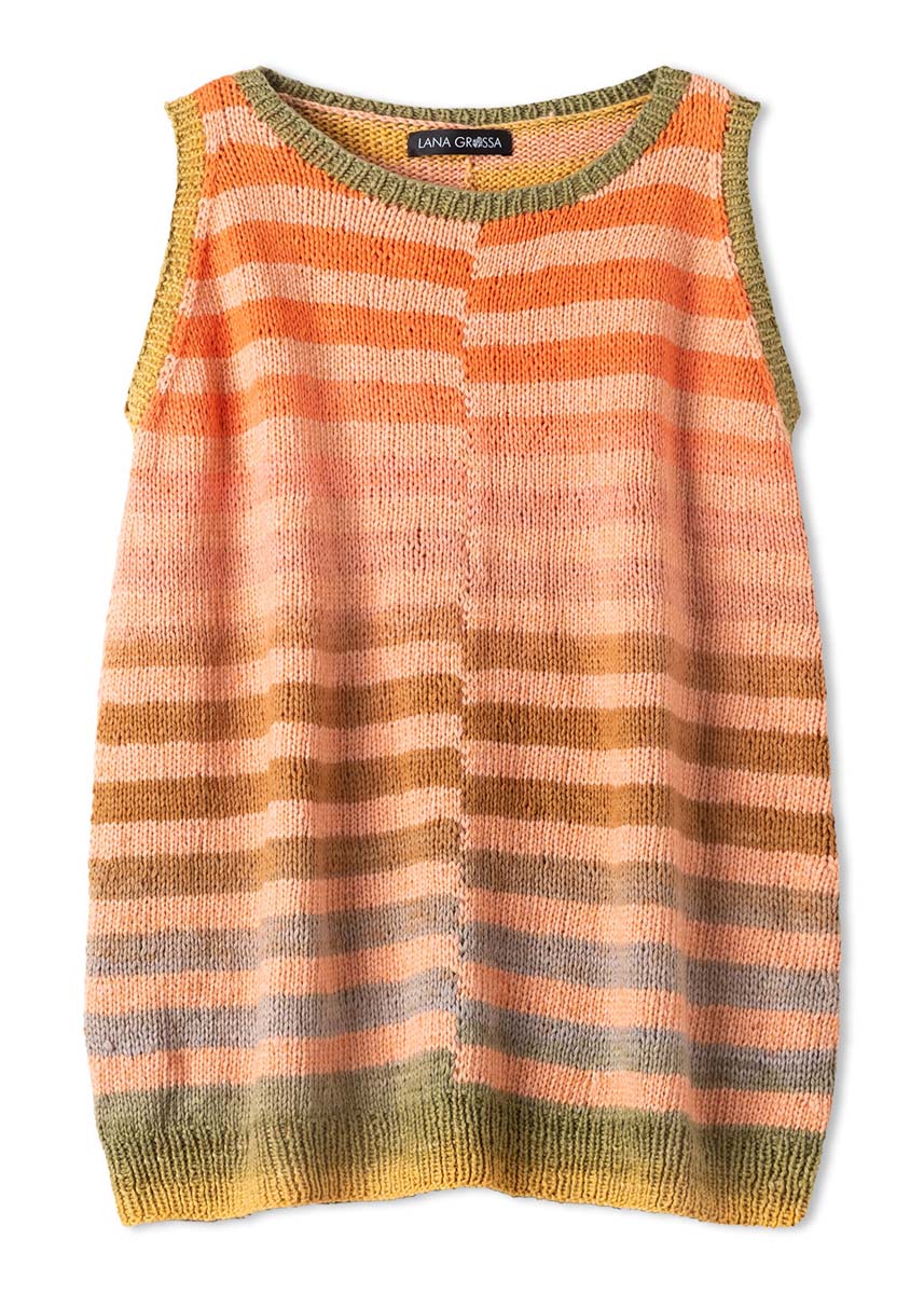 Lana Grossa „Cotonella“ (100% bomull (Pima), løpelengde 280 m/100 g), 200 (200 - 300) g i gråbeige/oliven/gul/blekoransje/oransje/laks/nougat (farge 15) og Lana Grossa „Summer Softness“ (80% bomull (bio), 20% ren ny ull (merino superfin), løpelengde 130 m/50 g), 150 (200 - 200) g i aprikos (farge 5); pinner nr. 4 og nr. 5, 1 rundpinne nr. 4, 40 cm lang, 3 maskemarkører.
