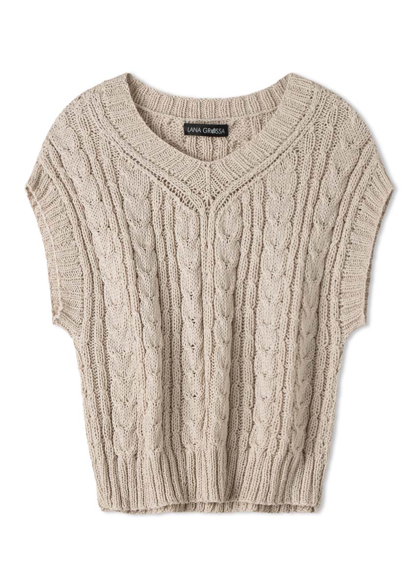 Lana Grossa Cotton Silk (70% bomull, 30% silke, løpelenge 140 m/50 g), 300 (350 – 400 – 450) g lysbeige (farge 9); pinner nr. 4 og 6, 1 rundpinne nr. 4, 40 cm lang, samt 1 flettepinne.