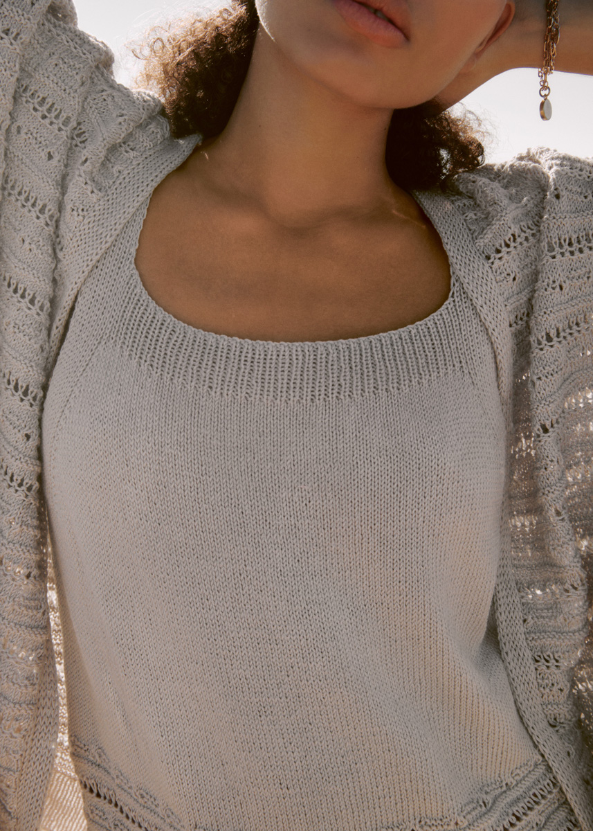 Lana Grossa-kvalitet „Cotton Wool“ (53 % ren ny uld (ekstrafin merino), 47 % bomuld, løbelængde = ca. 195 m / 50 gr.): ca. 200(250) gr gråbeige (fv 8), strikkepinde nr. 3 og 3½.