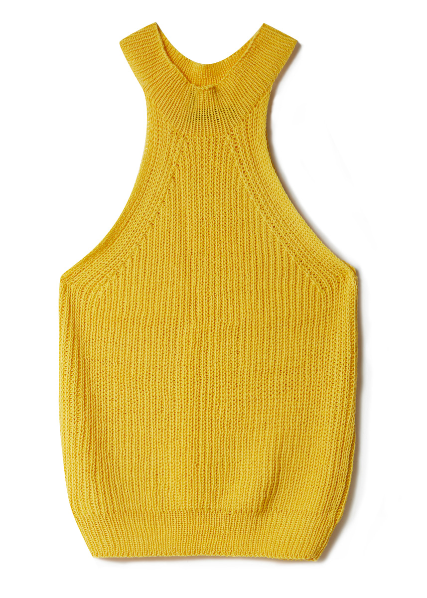 Lana Grossa Cotton Wool (53% ren ny ull (merino extrafin), 47% bomull, löplängd 195 m/50 g), 250 (300 - 300) g gul (färg 13); stickor nr. 3,5 och 1 rundsticka nr. 3, 40 cm lång.