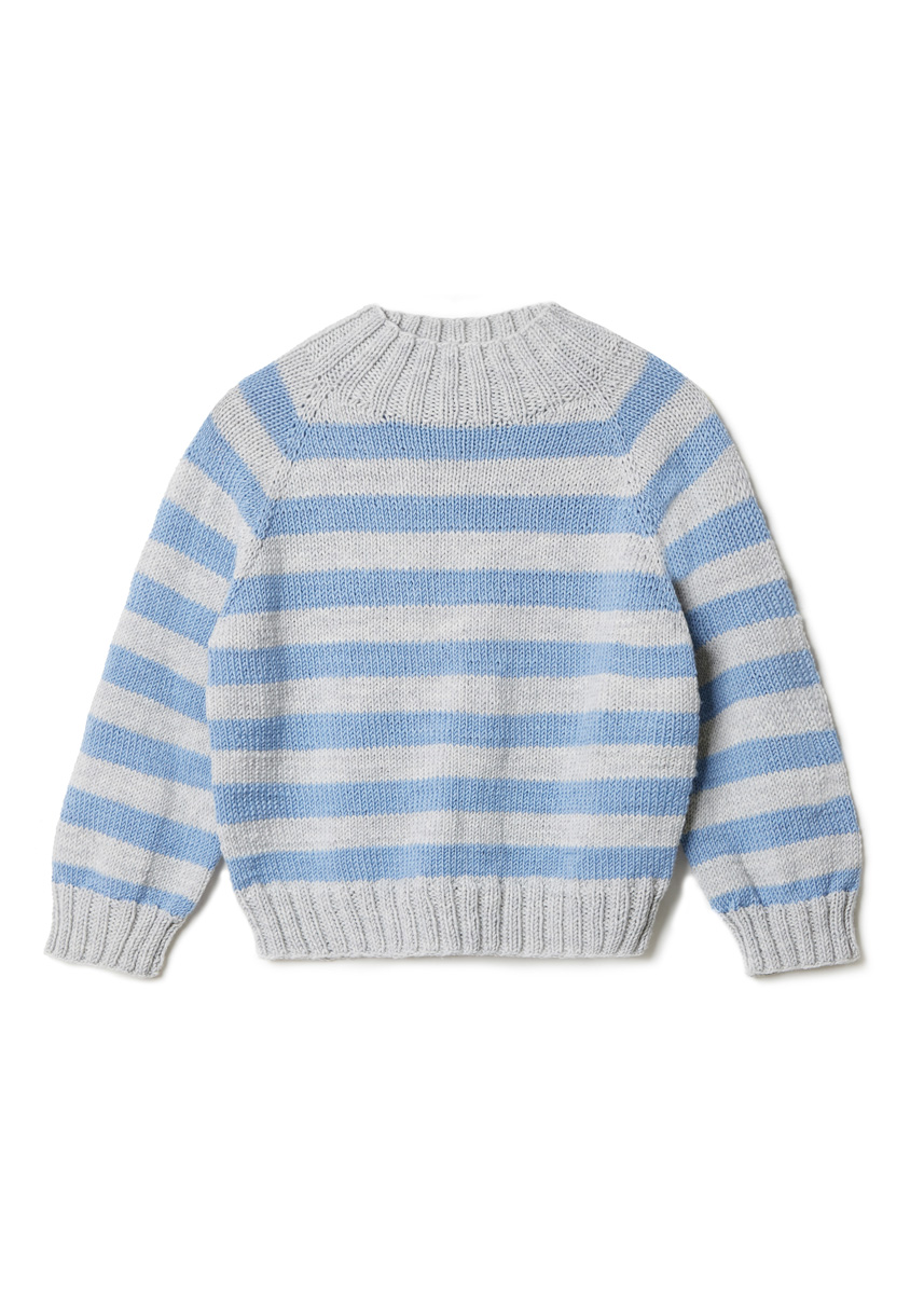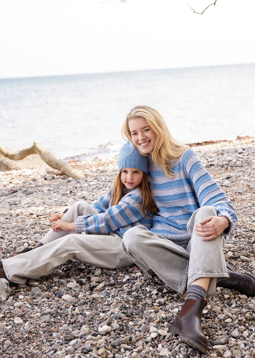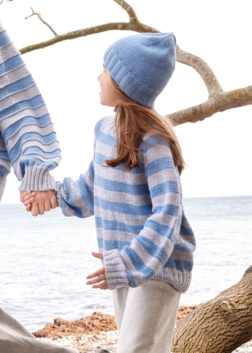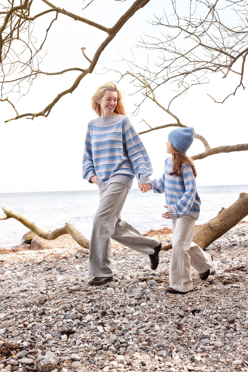 Lana Grossa Cool Wool Big Mélange (100 % ren ny ull (merino extrafine), LL = ca. 120 m/50 g), 200 (250 – 300 – 350) g lys grå melert (frg 616) og 150 (150 – 200 – 250) g lys blå melert (frg 1620) Pinner: Rundpinne (50 og 100 cm) og strømpepinner nr. 4, rundpinne (40, 60, 80 og 100 cm) og strømpepinner nr. 4,5, to hjelpepinner for å legge m til side Tilbehør: 9 maskemarkører (MM)