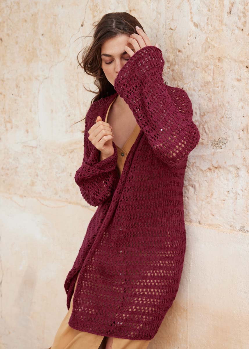 Lana Grossa „Campo“ (65% bomull, 25% viskose, 10% iin, løpelengde 165 m/50 g), 550 g i burgunder (farge 26); 1 rundpinner nr. 4, 40, 60 og 100 cm lang, 1 rundpinne nr. 3,5, 120 cm lang, 4 maskemarkører (MM).