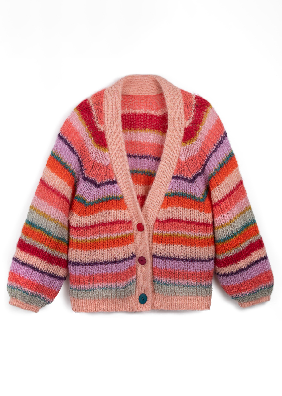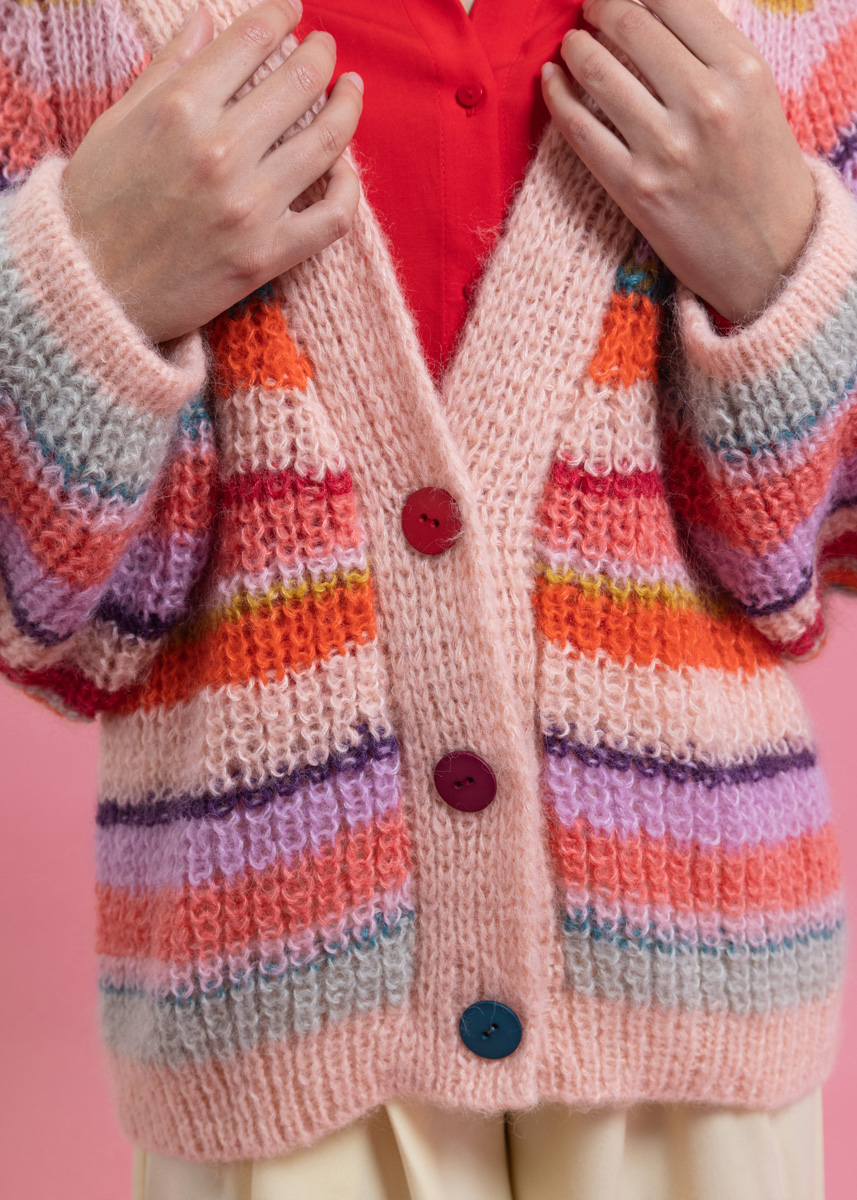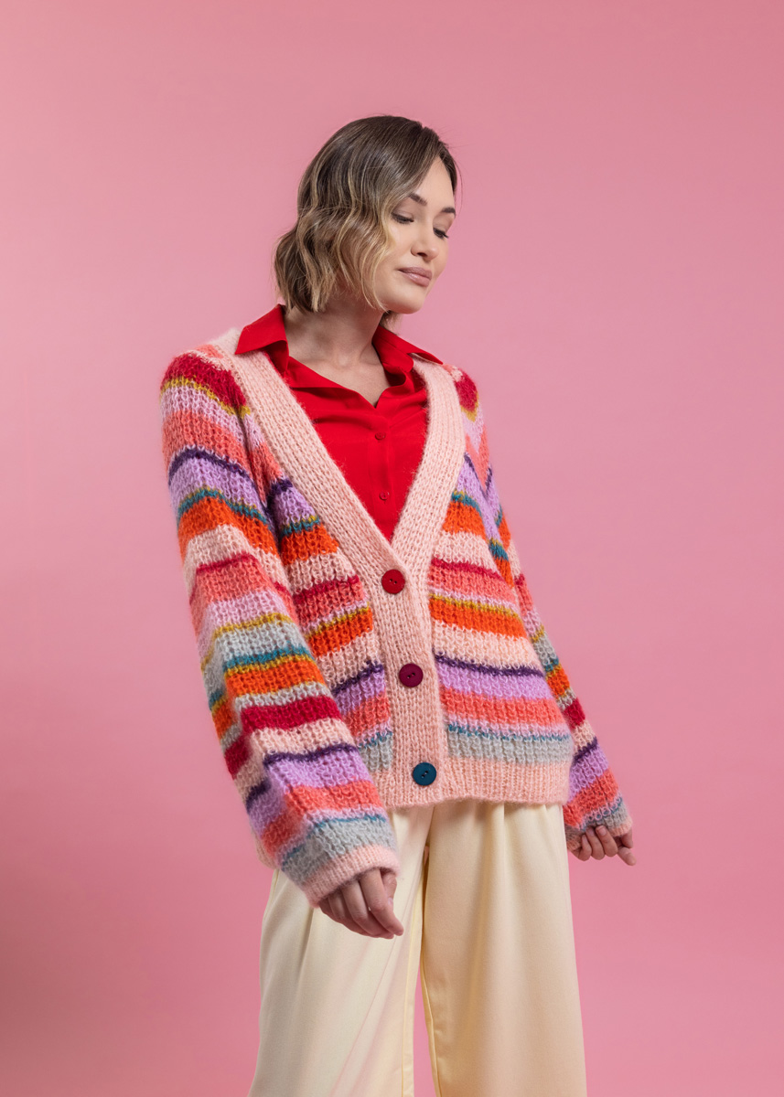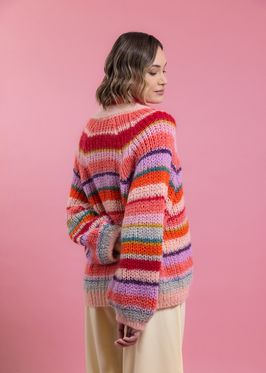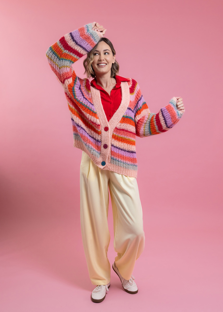 Cardiganen stickas med dubbelt garn och sömlöst i ett stycke, uppifrån och ned. Stolpen stickas separat med tredubbelt garn och sys på till slutt. Modellen har en total längd på 60 (62 - 64 - 66 - 68 - 70) cm. Bystvidden är anpassad så att den är 26 cm större än en bystomkrets på 80 cm (26 cm större än en bystomkrets på 88 cm - 26 cm större än en bystomkrets på 96 cm - 30 cm större än en bystomkrets på 104 cm - 28 cm större än en bystomkrets på 116 cm - 22 cm större än en bystomkrets på 128 cm).