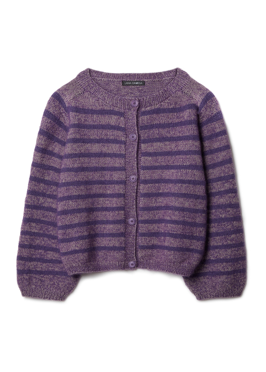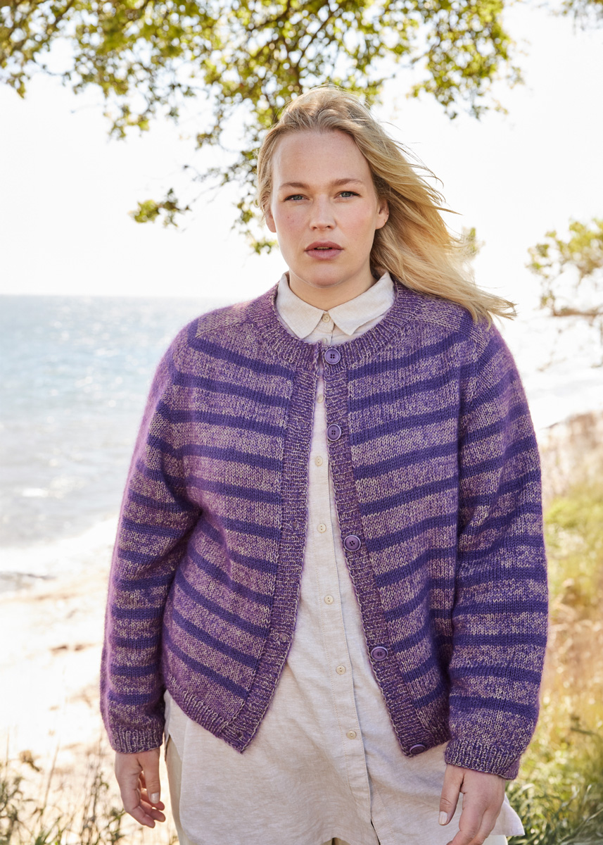 Lana Grossa Merino Superiore (100% ren ny ull (merino extrafine), löplängd = ca. 180 m/50 g), 300 (350 – 350 – 400) g taupe (färg 44) och 150 (150 – 200 – 250) g gråviolett (färg 46) och Lana Grossa Silkhair (70% mohair (superkid), 30% silke, löplängd = ca. 210 m/25 g), 150 (175 – 200 – 225) g mörk violett (färg 193)