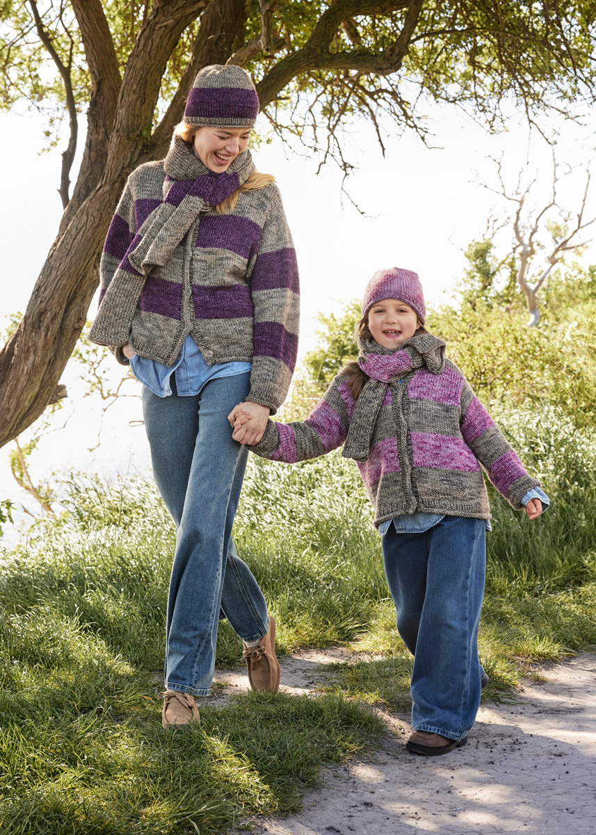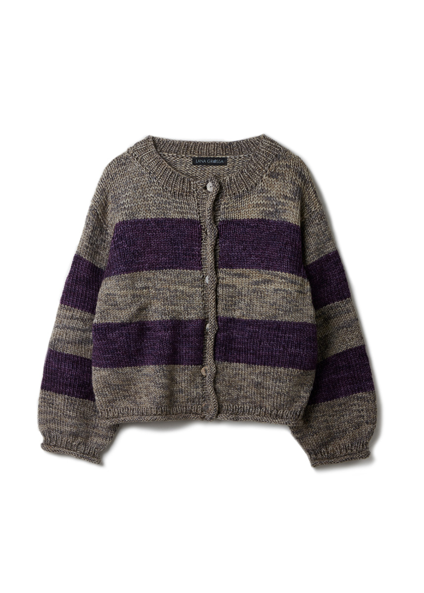 Lana Grossa Vintage Chunky (100% ren ny ull (merino), LL = ca. 80 m/50 g), 400 (450 – 500) g beige/kaki (frg 1), 250 (250 – 300) g antikk fiolett/aubergine (frg 08) Pinner: Rundpinne (40, 80 og 120 cm) nr. 6, rundpinne (40, 80 og 120 cm) nr. 7, to hjelpepinner for å legge m til side Tilbehør: 2 maskemarkører (MM), 6 knapper, ca. 20 mm Ø