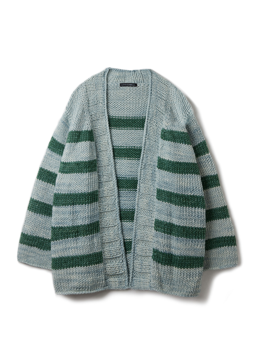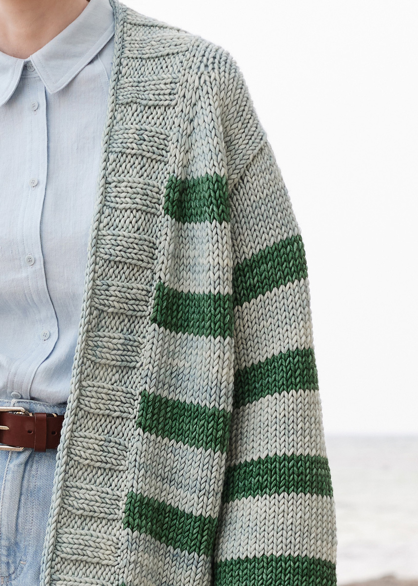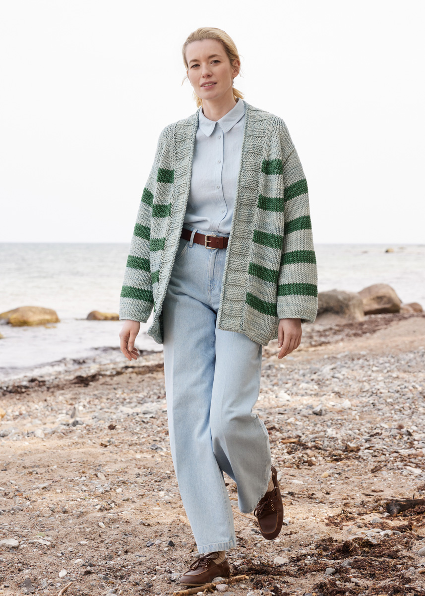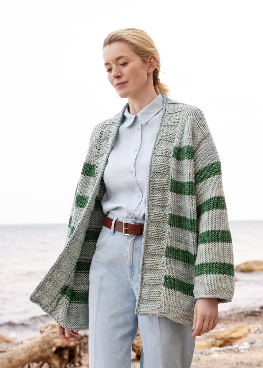 Lana Grossa Vintage Superchunky (100% ren ny ull (merino), LL = ca. 80 m/100 g), 800 (800 – 900) g hvitgrønn (frg 517) og 300 g opalgrønn (frg 518) Pinner/heklenål: Rundpinne (40, 80, 100 eller 120 cm) nr. 8, rundpinne (120 cm) nr. 6,5, heklenål nr. 5,5, tre hjelpepinner for å legge m til side Tilbehør: 1 maskemarkør (MM)