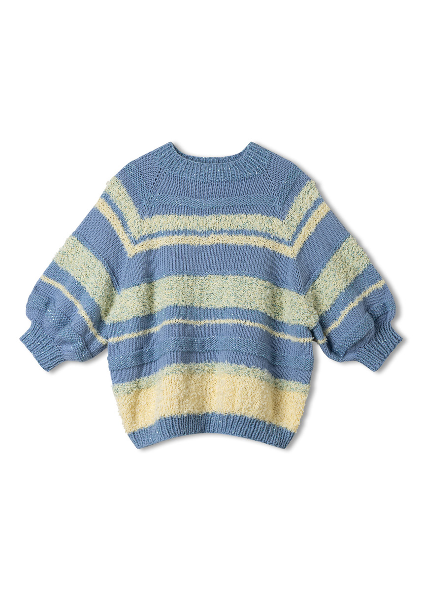 Lana Grossa Summer Softness (80% bomull (bio), 20% ren ny ull (merino superfin), løpelengde = ca. 130 m/50 g), 250 (250 - 300 - 300) g i lysblå (farge 30). Lana Grossa Frizzante (54% bomull, 46% polyamid, løpelengde = ca. 105 m/50 g), 150 (150 - 200 -200) g i vanilje (farge 11). Lana Grossa Glamour (55% polyamid, 45% polyester, løpelengde = ca. 110 m/50 g), 100 (100 - 100 - 150) g i mykblå (farge 4). 80 cm og 100 cm eller 120 cm lange rundpinner nr. 6; 50 cm og 100 cm lange rundpinner og 5 settpinner nr. 5. 8 maskemarkører [MM] Tips: For begynnelsen av omgangen anbefales det å
