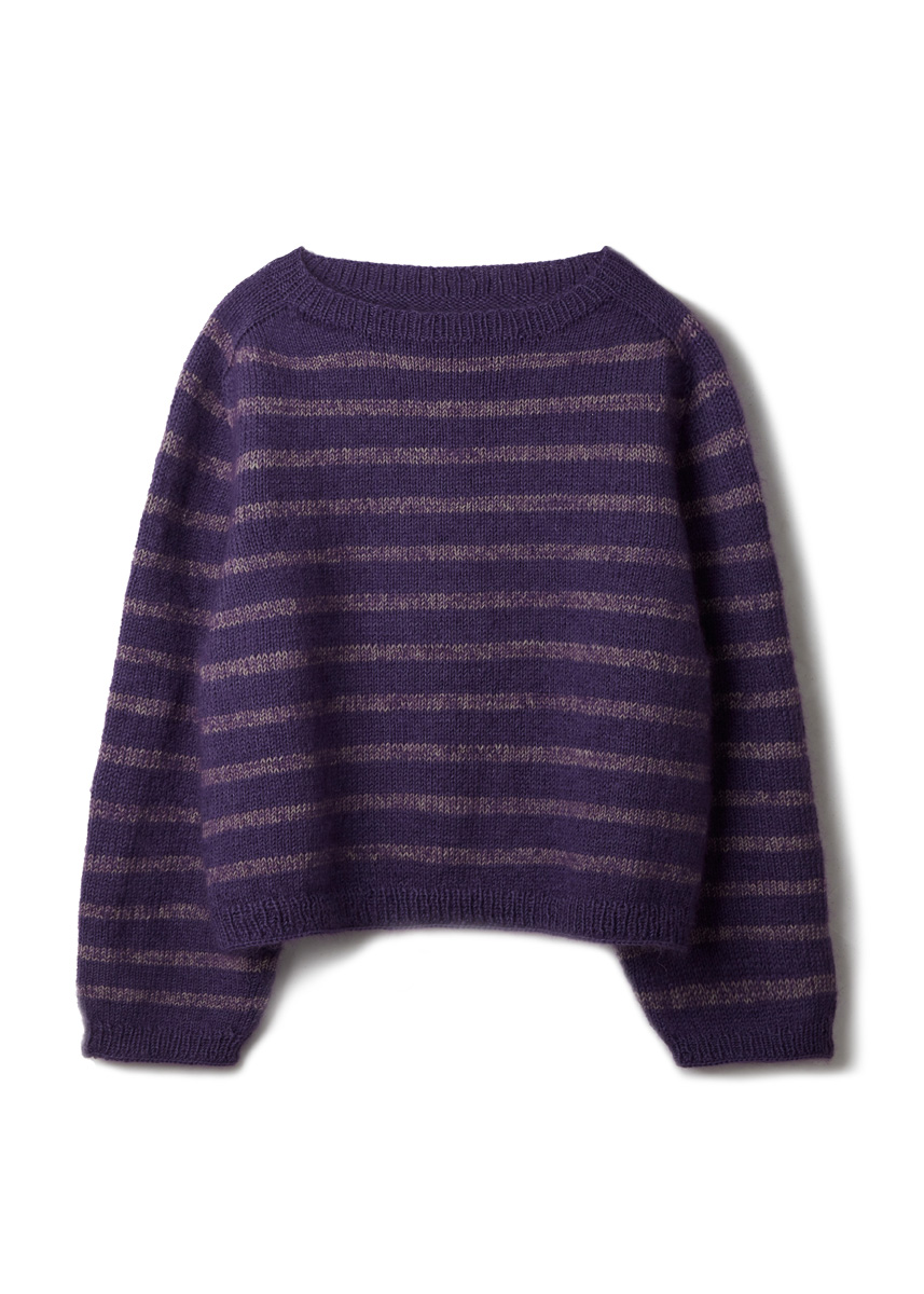 Lana Grossa Merino Superiore (100 % ren ny ull (merino extrafine), LL = ca 180 m/50 g), 250 (300 – 350) g gråfiolett (frg 46) og 150 (200 – 250) g taupe (frg 44). Lana Grossa Silkhair (70 % mohair (superkid), 30% silke, LL = ca. 210 m/25 g), 150 (175 – 200) g mørk fiolett (frg 193) Pinner: Rundpinne (50, 80, 100 eller 120 cm) og fem strømpep nr. 3,5, rundpinne (60, 80 og 100 eller 120 cm) nr. 4, to hjelpepinner for å legge m til side Tilbehør: 4 maskemarkører (MM)