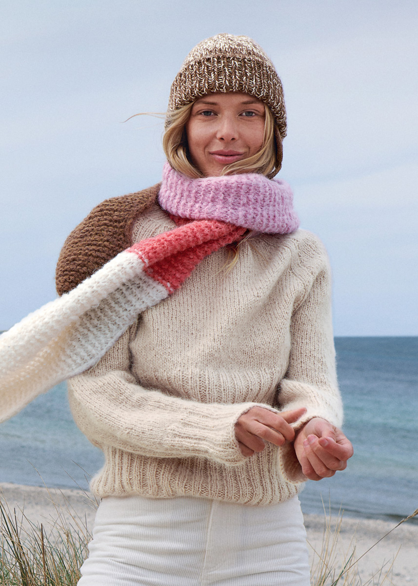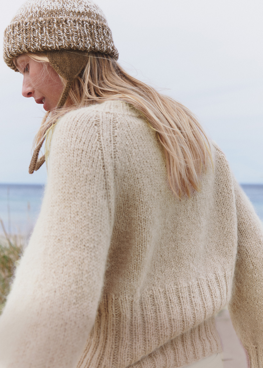 Lana Grossa-kvalitet „Setasuri“ (69 % alpacka (Suri), 31 % silke; löplängd = 212 m/25 g): 300 (350/400/450) g beige (färg 21); en 40 cm och en 80/100 cm lång rundsticka nr. 5 och 5,5 mm; maskmarkerare (en i en annan färg för att markera början av omg).